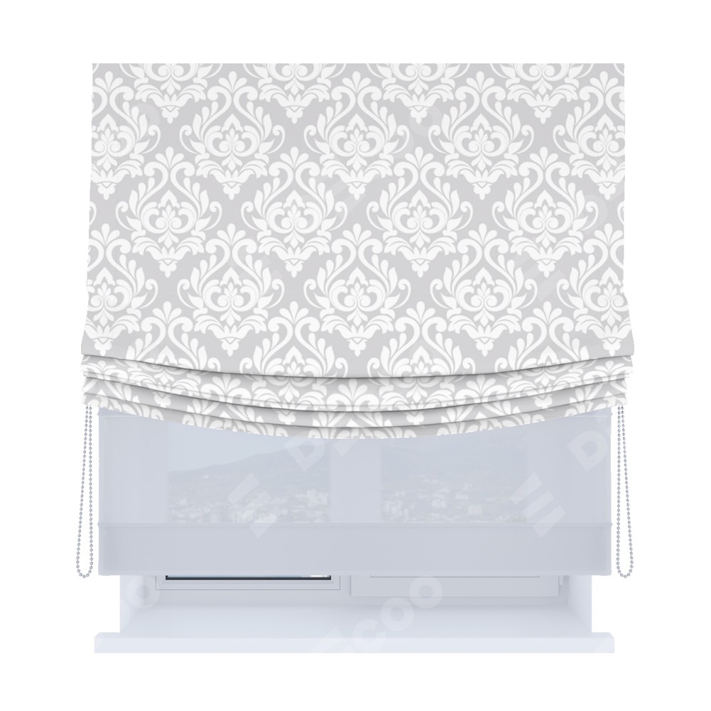 Римская штора день-ночь производителя «Cortin», используется для проёма, пошита из двух полотен, с лицевой блэкаут с нанесением сублимационной печати «Дамаск светлый», вторая ткань тюль (по стандарту комплектуется тюль белого цвета артикул V-01). Имеет универсальный механизм и подходит для монтажа: на потолок, на стену и в нишу. Удобное управление каждой шторой отдельно.
