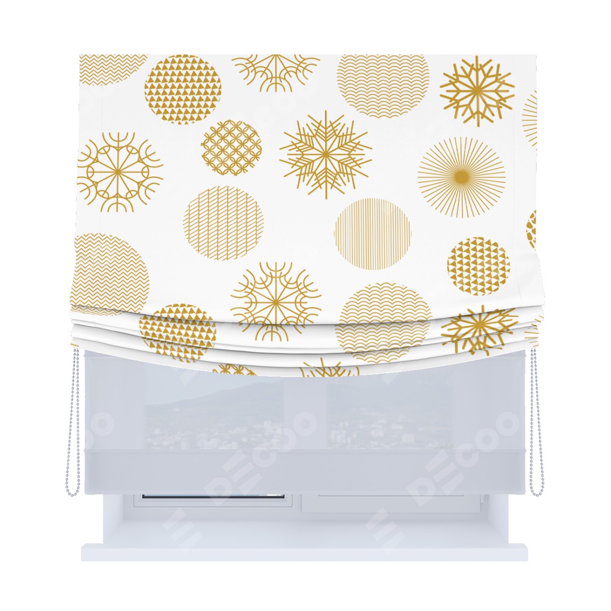 Римская штора день-ночь производителя «Cortin», используется для проёма, пошита из двух полотен, с лицевой блэкаут с нанесением сублимационной печати «Золотые шары», вторая ткань тюль (по стандарту комплектуется тюль белого цвета артикул V-01). Имеет универсальный механизм и подходит для монтажа: на потолок, на стену и в нишу. Удобное управление каждой шторой отдельно.