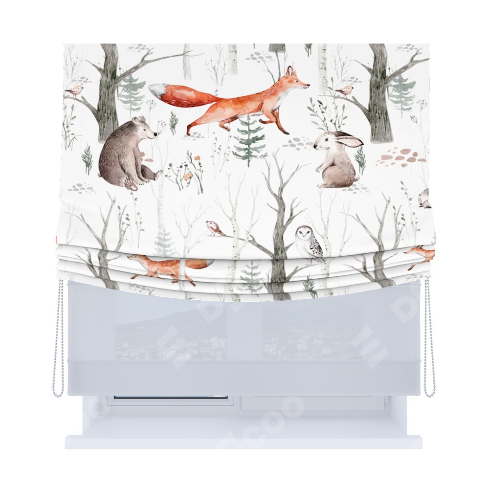 Римская штора день-ночь производителя «Cortin», используется для проёма, пошита из двух полотен, с лицевой блэкаут с нанесением сублимационной печати «Лесной питомник», вторая ткань тюль (по стандарту комплектуется тюль белого цвета артикул V-01). Имеет универсальный механизм и подходит для монтажа: на потолок, на стену и в нишу. Удобное управление каждой шторой отдельно.