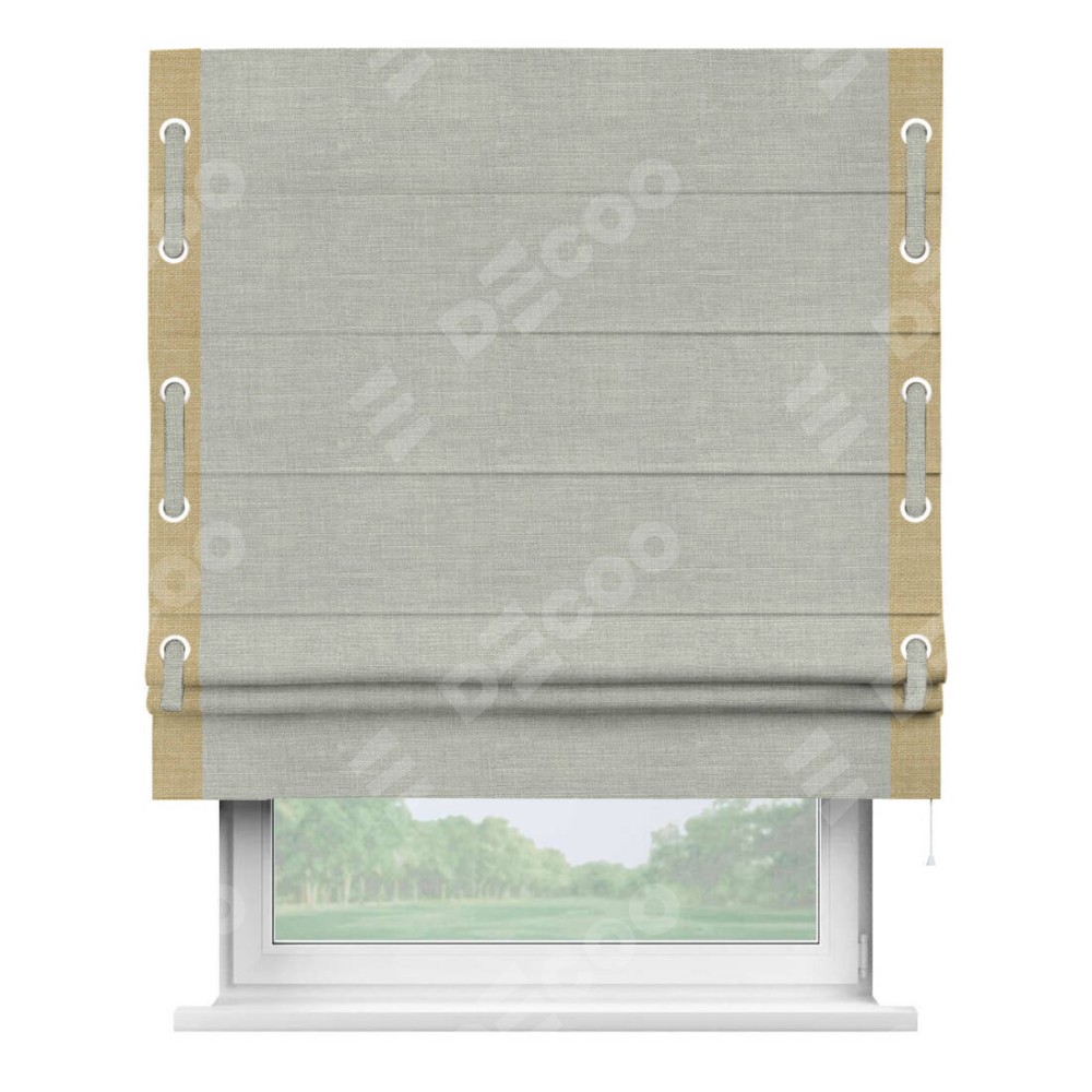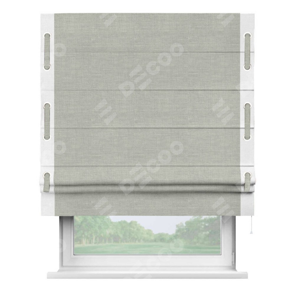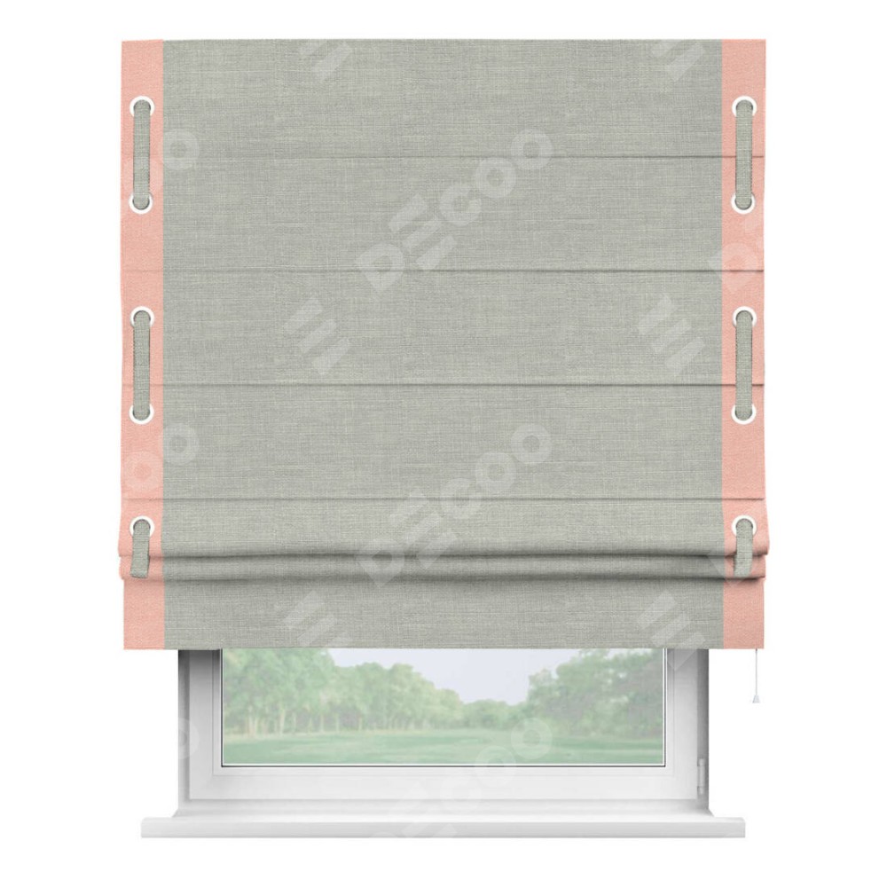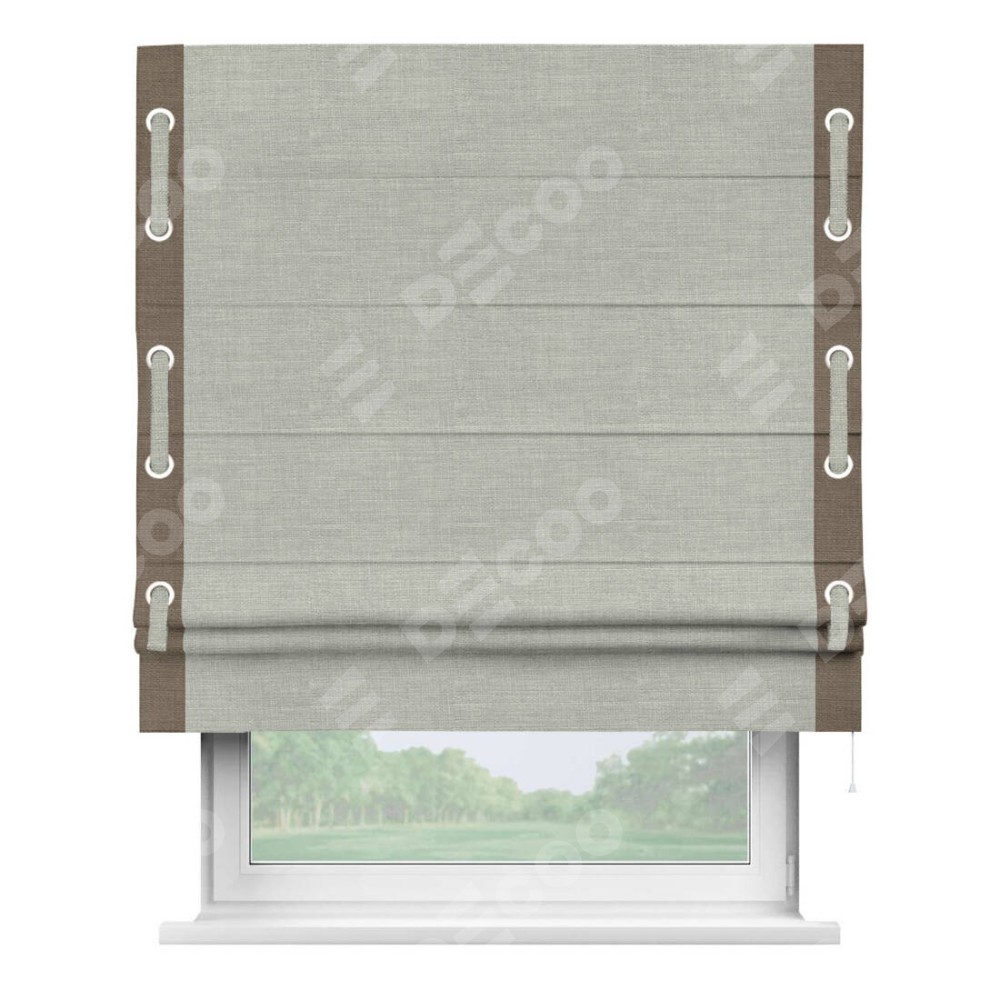 Римская штора производителя «Cortin», используется для проёма, пошита из ткани лён серый, артикул 7440. Отделка шторы кантом «Стрим Дуо» на кантах расположены люверсы с пояском, ткань для канта используется из льна разной расцветки на выбор. Ткань для пояска обычно используется из основной ткани шторы, а так же можно сделать из любой расцветки по желанию. Имеет универсальный механизм и подходит для монтажа: на потолок, на стену и в нишу.