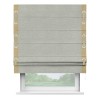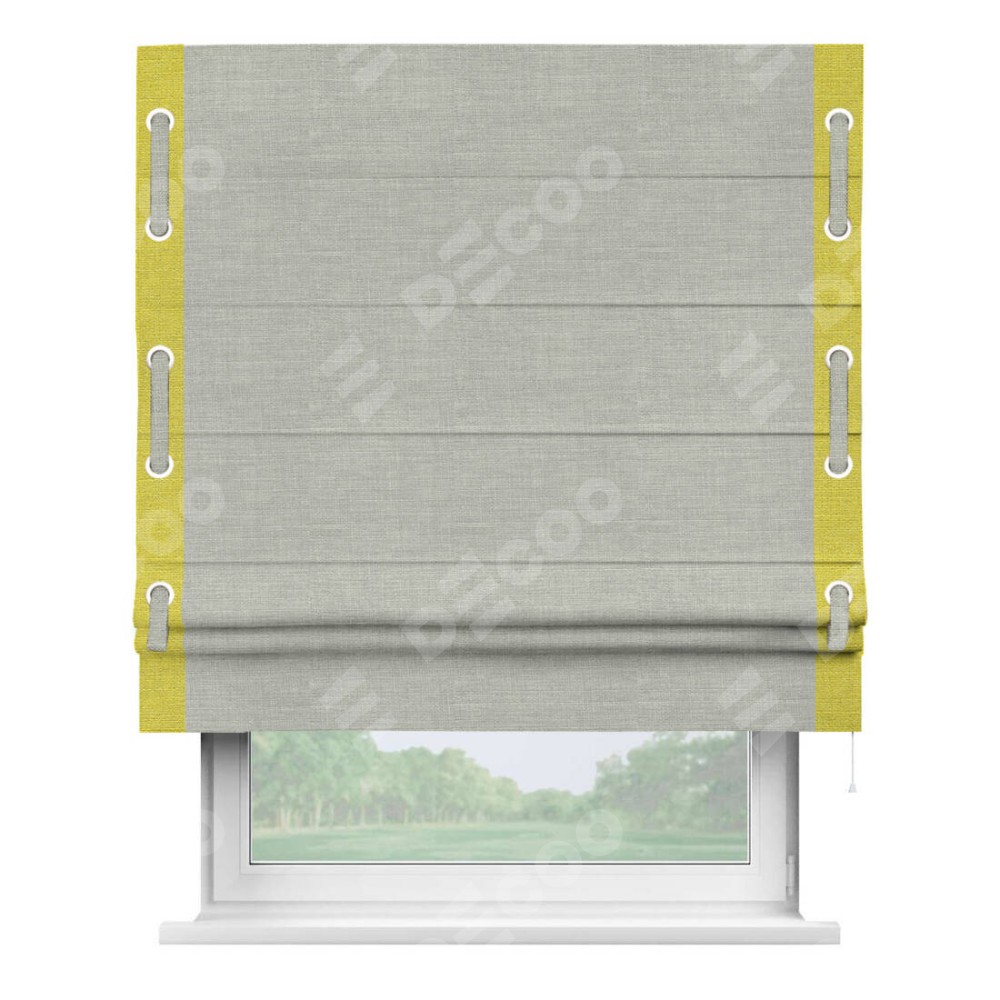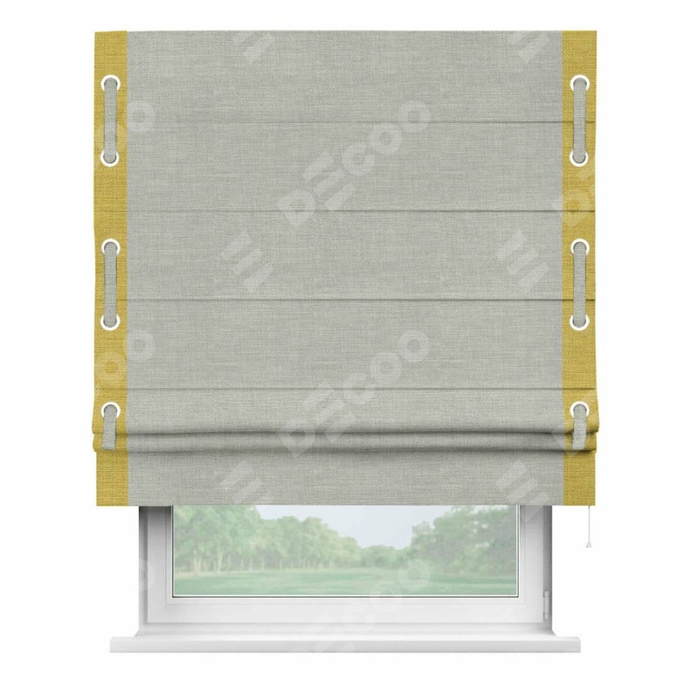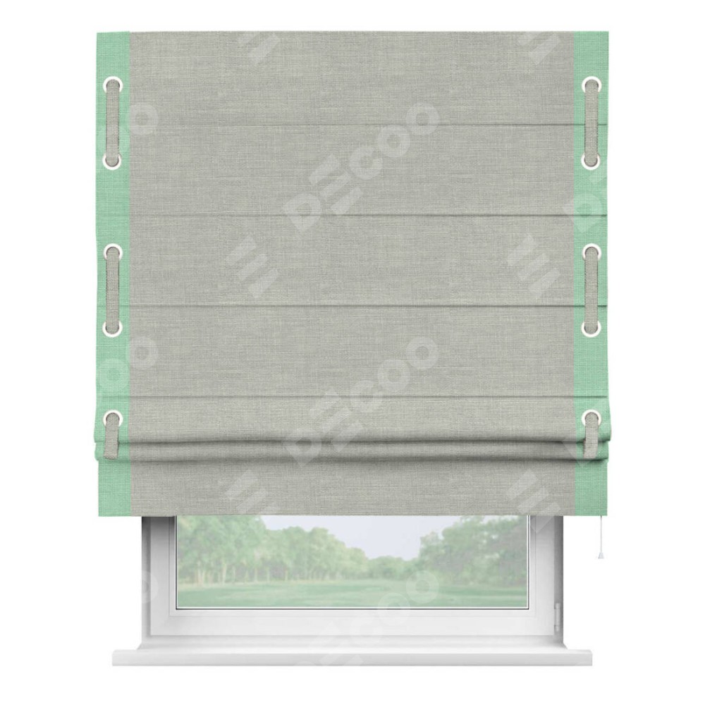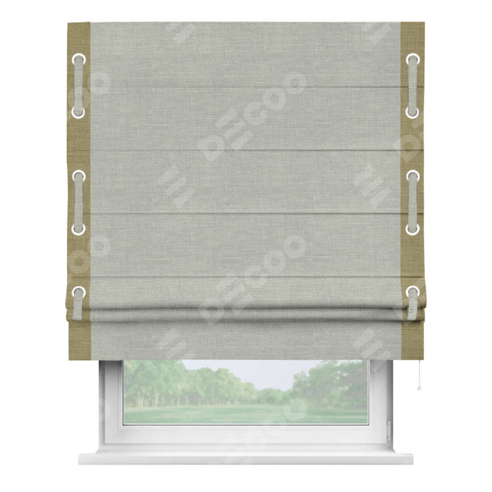 Римская штора производителя «Cortin», используется для проёма, пошита из ткани лён серый, артикул 7440. Отделка шторы кантом «Стрим Дуо» на кантах расположены люверсы с пояском, ткань для канта используется из льна разной расцветки на выбор. Ткань для пояска обычно используется из основной ткани шторы, а так же можно сделать из любой расцветки по желанию. Имеет универсальный механизм и подходит для монтажа: на потолок, на стену и в нишу.