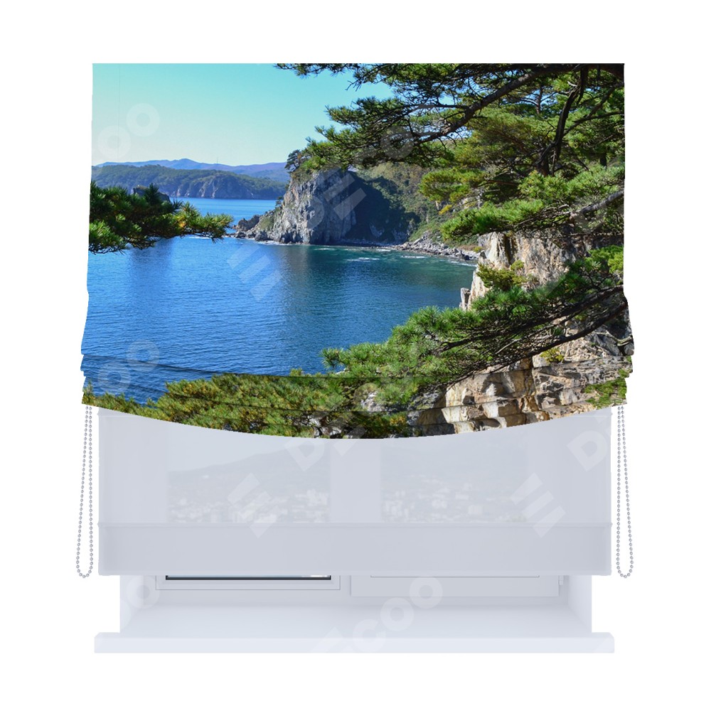 Римская штора день-ночь производителя «Cortin», используется для проёма, пошита из двух полотен, с лицевой блэкаут с нанесением сублимационной печати «Море и сосны», вторая ткань тюль (по стандарту комплектуется тюль белого цвета артикул V-01). Имеет универсальный механизм и подходит для монтажа: на потолок, на стену и в нишу. Удобное управление каждой шторой отдельно.