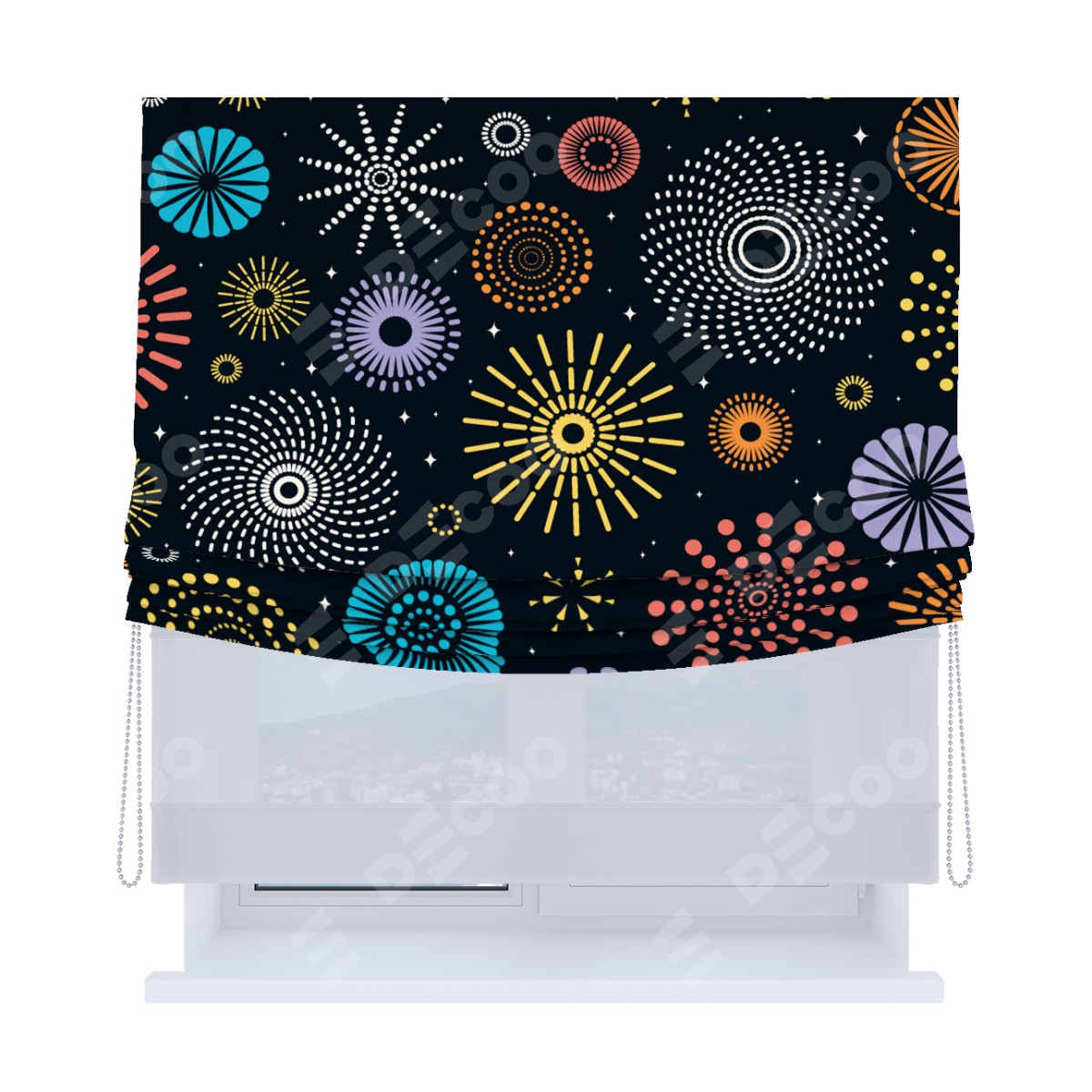 Римская штора день-ночь производителя «Cortin», используется для проёма, пошита из двух полотен, с лицевой блэкаут с нанесением сублимационной печати «Праздничный фейерверк», вторая ткань тюль (по стандарту комплектуется тюль белого цвета артикул V-01). Имеет универсальный механизм и подходит для монтажа: на потолок, на стену и в нишу. Удобное управление каждой шторой отдельно.