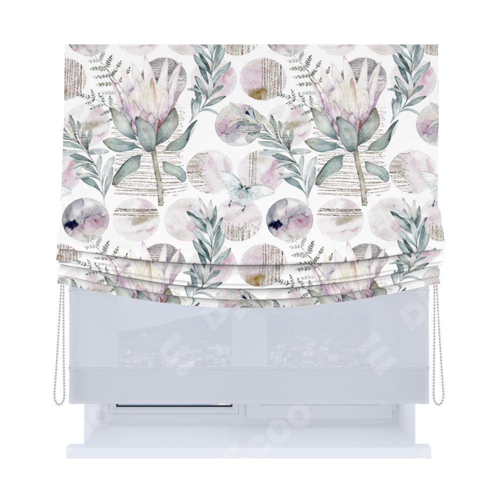 Римская штора день-ночь производителя «Cortin», используется для проёма, пошита из двух полотен, с лицевой блэкаут с нанесением сублимационной печати «Розовый лотос», вторая ткань тюль (по стандарту комплектуется тюль белого цвета артикул V-01). Имеет универсальный механизм и подходит для монтажа: на потолок, на стену и в нишу. Удобное управление каждой шторой отдельно.