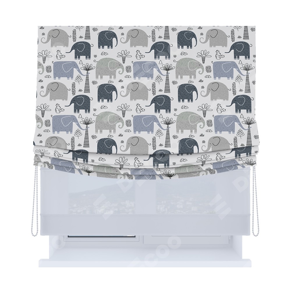 Римская штора день-ночь производителя «Cortin», используется для проёма, пошита из двух полотен, с лицевой блэкаут с нанесением сублимационной печати «Серые слоники», вторая ткань тюль (по стандарту комплектуется тюль белого цвета артикул V-01). Имеет универсальный механизм и подходит для монтажа: на потолок, на стену и в нишу. Удобное управление каждой шторой отдельно.