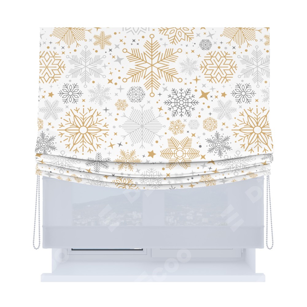Римская штора день-ночь производителя «Cortin», используется для проёма, пошита из двух полотен, с лицевой блэкаут с нанесением сублимационной печати «Снежное очарование», вторая ткань тюль (по стандарту комплектуется тюль белого цвета артикул V-01). Имеет универсальный механизм и подходит для монтажа: на потолок, на стену и в нишу. Удобное управление каждой шторой отдельно.