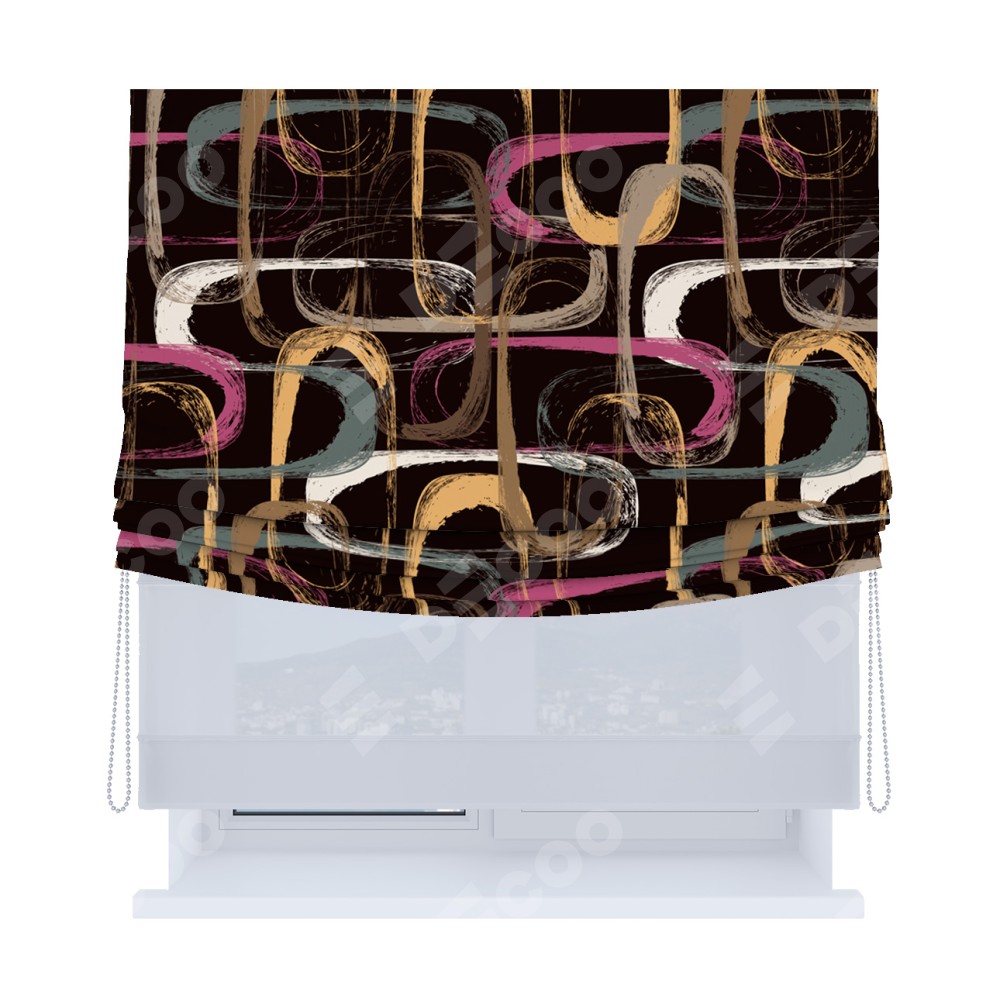 Римская штора день-ночь производителя «Cortin», используется для проёма, пошита из двух полотен, с лицевой блэкаут с нанесением сублимационной печати «Тёмная палитра», вторая ткань тюль (по стандарту комплектуется тюль белого цвета артикул V-01). Имеет универсальный механизм и подходит для монтажа: на потолок, на стену и в нишу. Удобное управление каждой шторой отдельно.