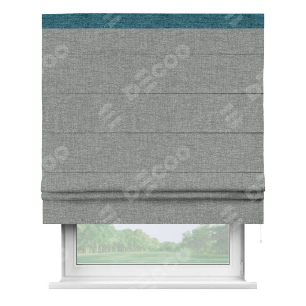 Римская штора производителя «Cortin», используется для проёма, пошита из ткани рогожка димаут тёмно-серый, артикул 80418. Отделка шторы кантом «Кинг», ткань для канта используется из рогожки димаут разной расцветки на выбор. Имеет универсальный механизм и подходит для монтажа: на потолок, на стену и в нишу.