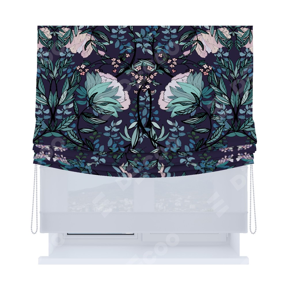 Римская штора «Кортин», день-ночь с мягкими складками, «Цветочный индиго»