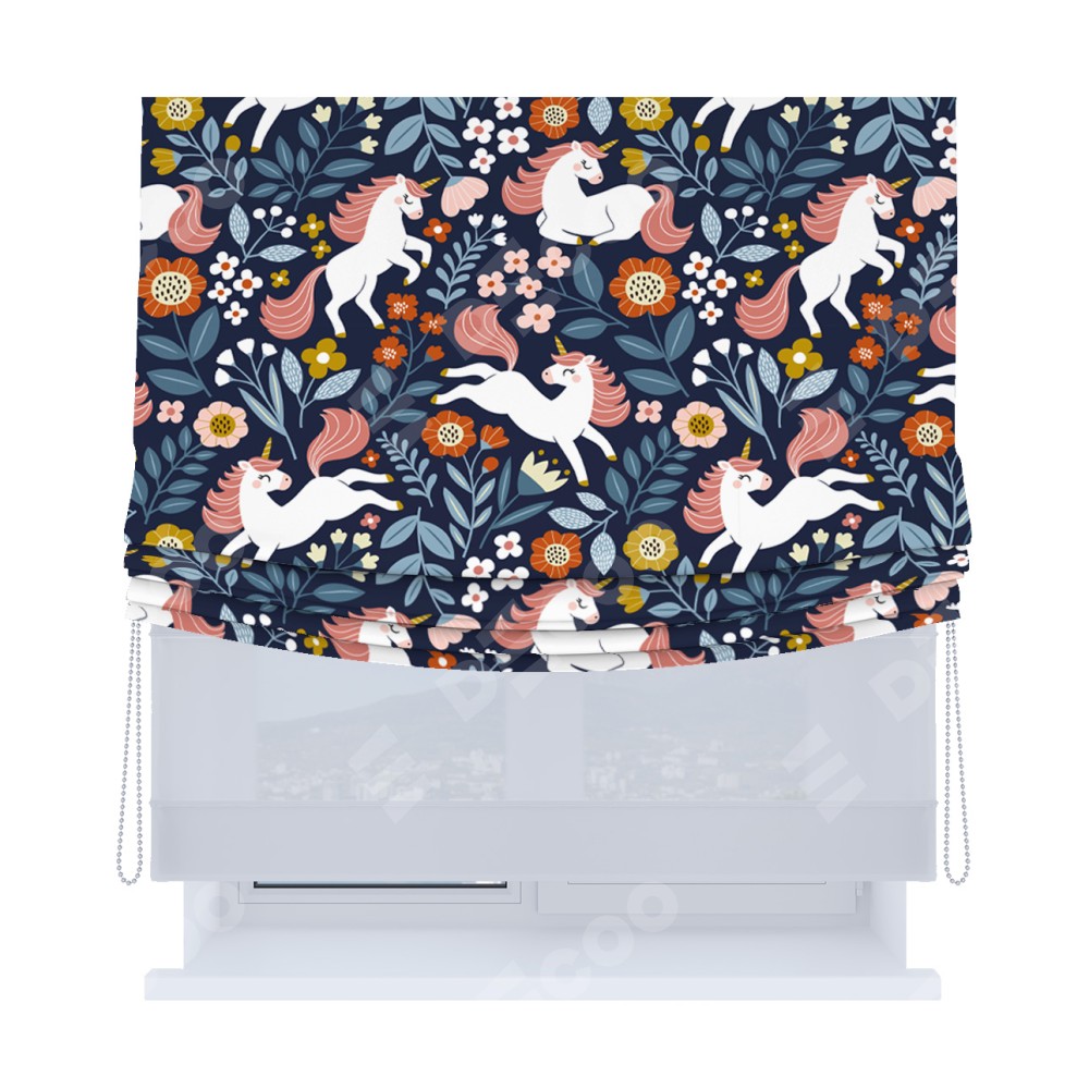 Римская штора «Кортин», день-ночь с мягкими складками, «Цветы и единороги»