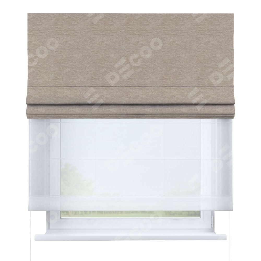 Римская штора день-ночь производителя «Cortin», используется для проёма, пошита из двух полотен, с лицевой стороны софт однотонный тёмно-бежевый артикул 1640, вторая ткань тюль (по стандарту комплектуется тюль белого цвета артикул V-01). Имеет универсальный механизм и подходит для монтажа: на потолок, на стену и в нишу.