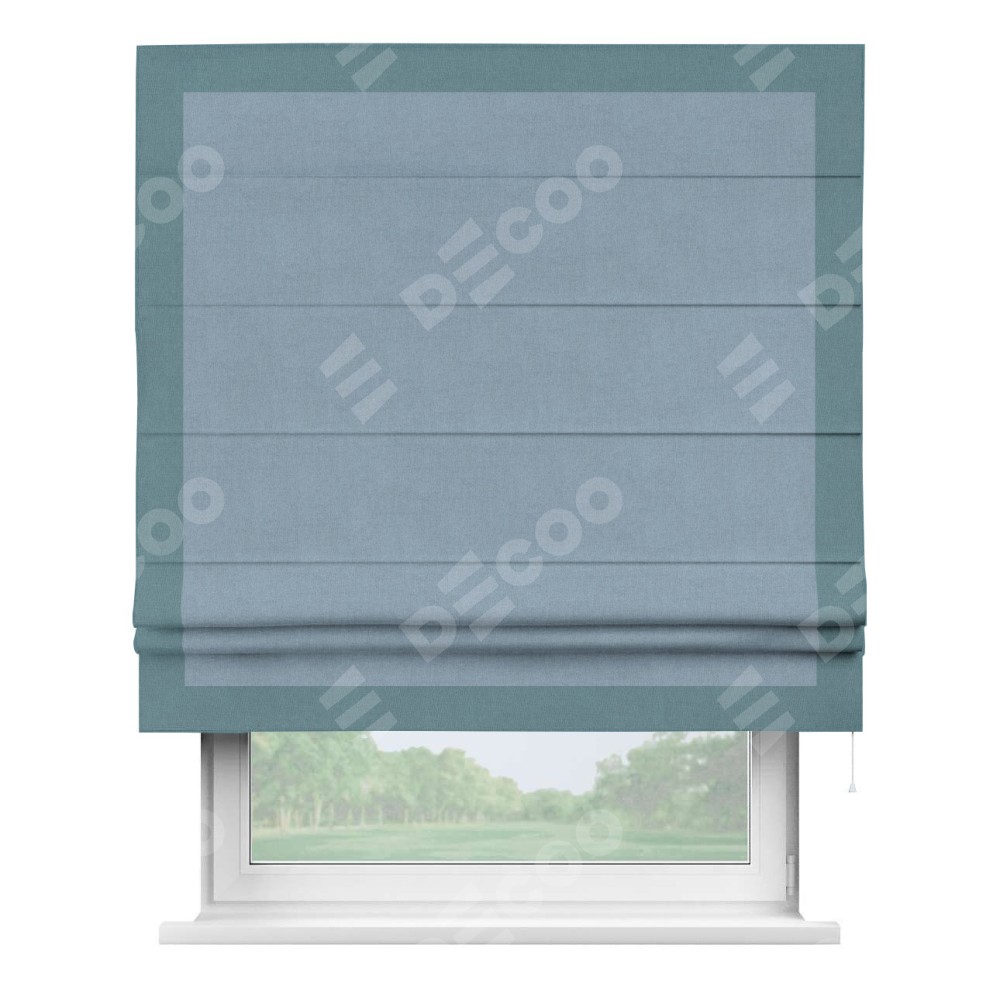 Римская штора производителя «Cortin», используется для проёма, пошита из ткани лён блэкаут голубой, артикул 69574. Отделка шторы кантом «Чесс», ткань для канта используется из льна разной расцветки на выбор. Имеет универсальный механизм и подходит для монтажа: на потолок, на стену и в нишу.