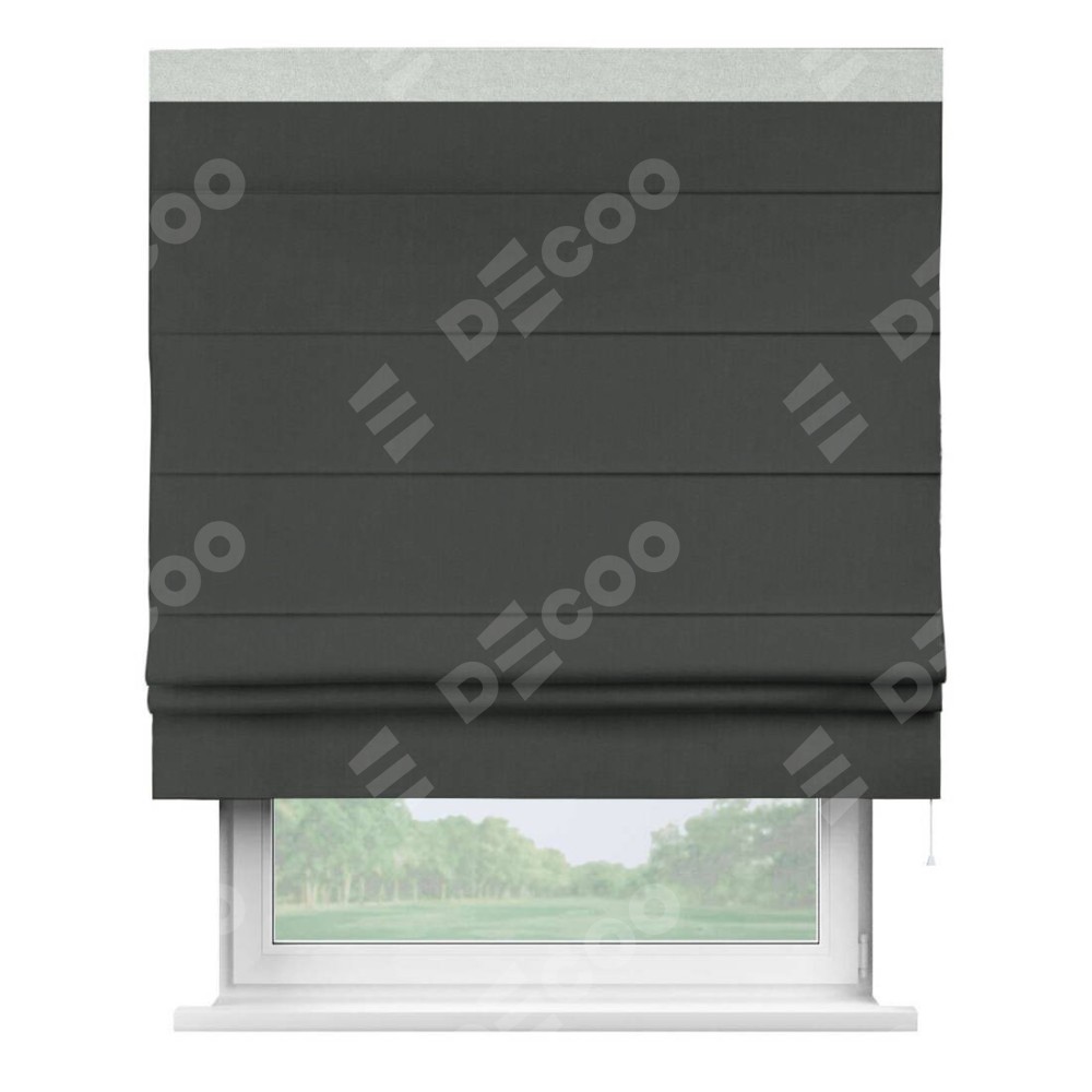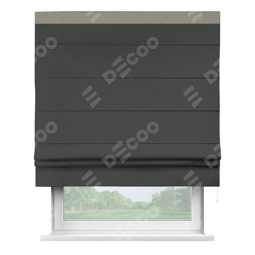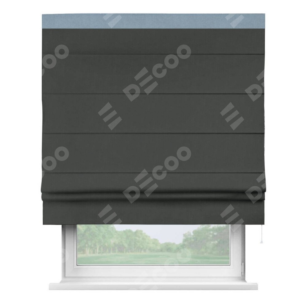 Римская штора производителя «Cortin», используется для проёма, пошита из ткани лён блэкаут графит, артикул 69448. Отделка шторы кантом «Кинг», ткань для канта используется из льна разной расцветки на выбор. Имеет универсальный механизм и подходит для монтажа: на потолок, на стену и в нишу.