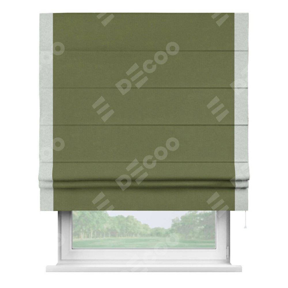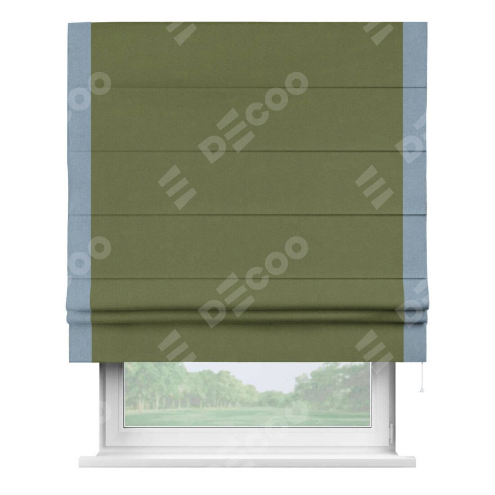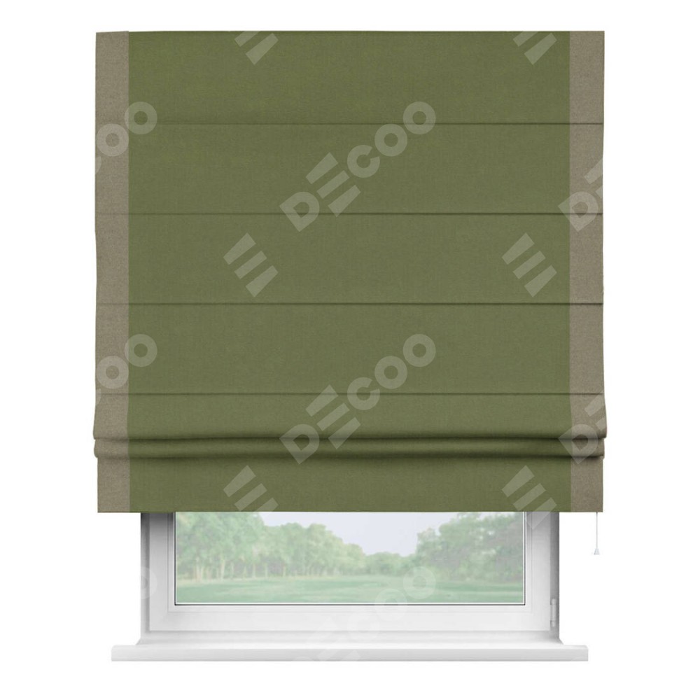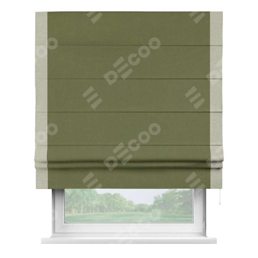 Римская штора производителя «Cortin», используется для проёма, пошита из ткани лён блэкаут оливковый, артикул 69516. Отделка шторы кантом «Стрим Дуо», ткань для канта используется из льна разной расцветки на выбор. Имеет универсальный механизм и подходит для монтажа: на потолок, на стену и в нишу.