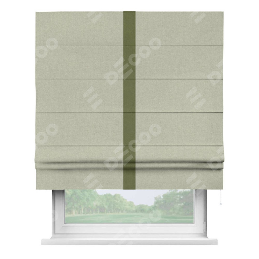 Римская штора производителя «Cortin», используется для проёма, пошита из ткани лён блэкаут серо-бежевый, артикул 69450. Отделка шторы кантом «Хайвэй», ткань для канта используется из льна разной расцветки на выбор. Имеет универсальный механизм и подходит для монтажа: на потолок, на стену и в нишу.