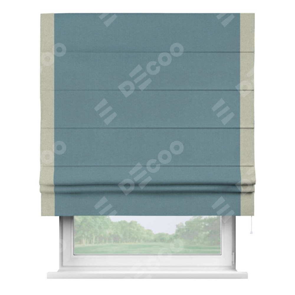 Римская штора производителя «Cortin», используется для проёма, пошита из ткани лён блэкаут синий, артикул 69528. Отделка шторы кантом «Стрим Дуо», ткань для канта используется из льна разной расцветки на выбор. Имеет универсальный механизм и подходит для монтажа: на потолок, на стену и в нишу.