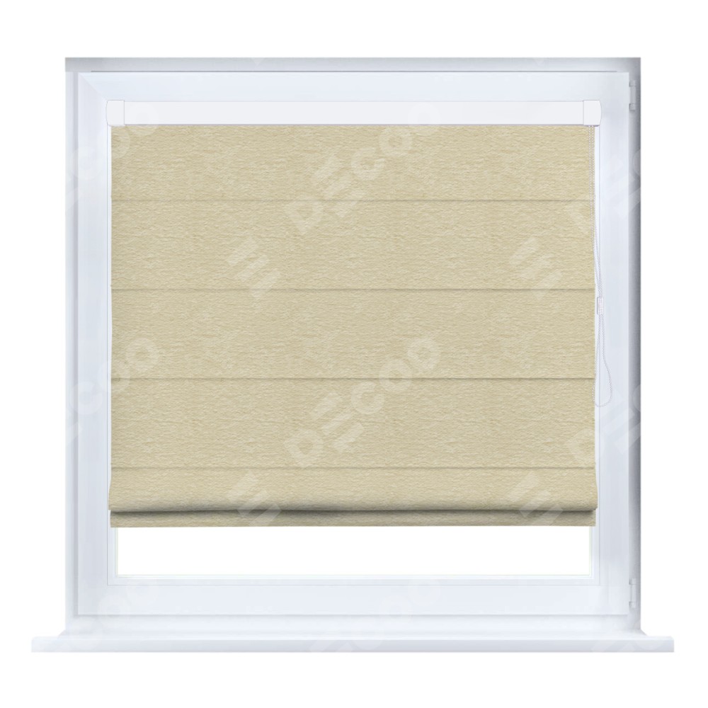 Римская штора кассетного типа, производителя «Cortin», устанавливается только на пластиковые окна и прилегает к стеклопакету, пошита из ткани софт однотонный светло-бежевый, артикул 54426.