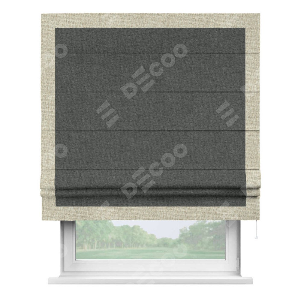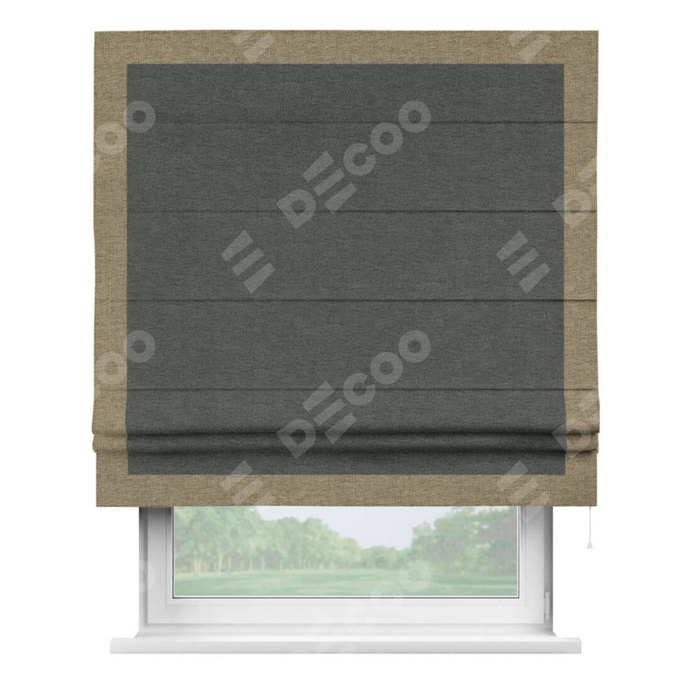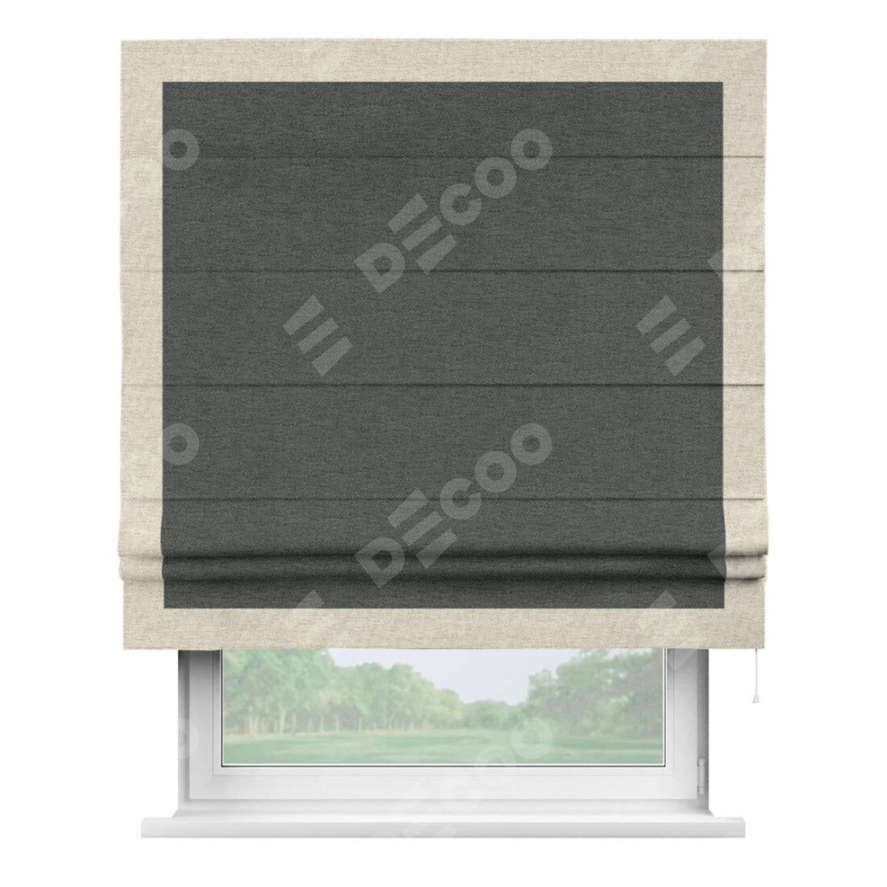 Римская штора производителя «Cortin», используется для проёма, пошита из ткани стиф димаут графит, артикул 44026. Отделка шторы кантом «Чесс», ткань для канта используется из стифа разной расцветки на выбор. Имеет универсальный механизм и подходит для монтажа: на потолок, на стену и в нишу.