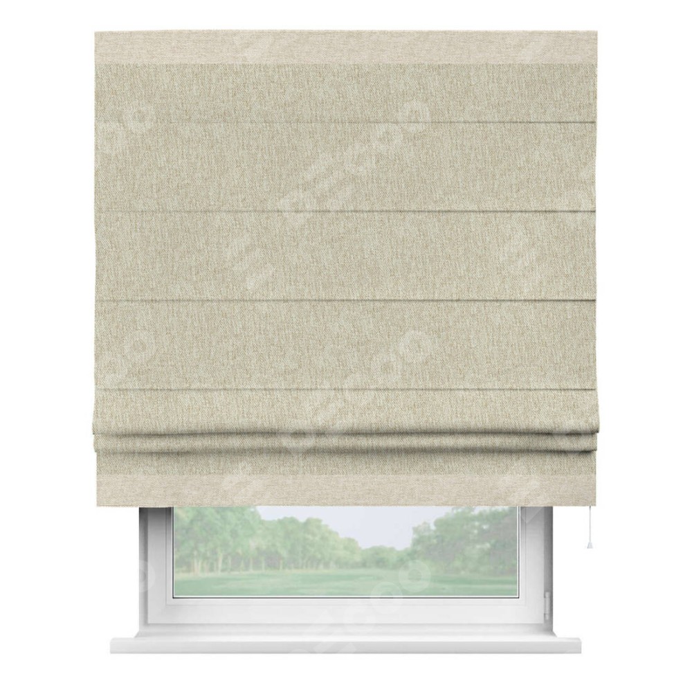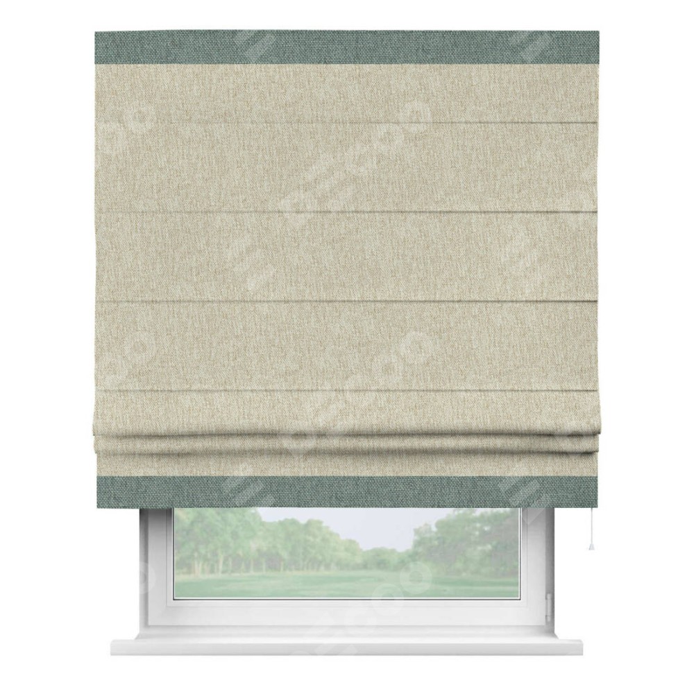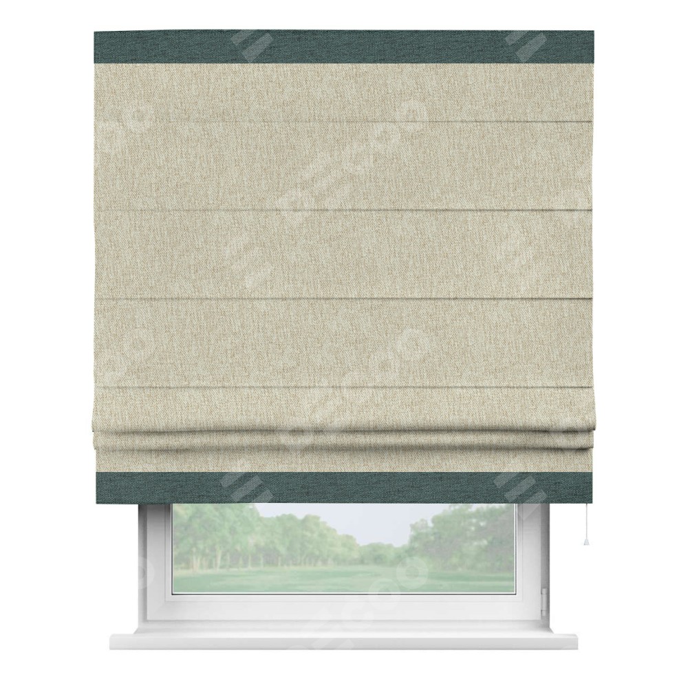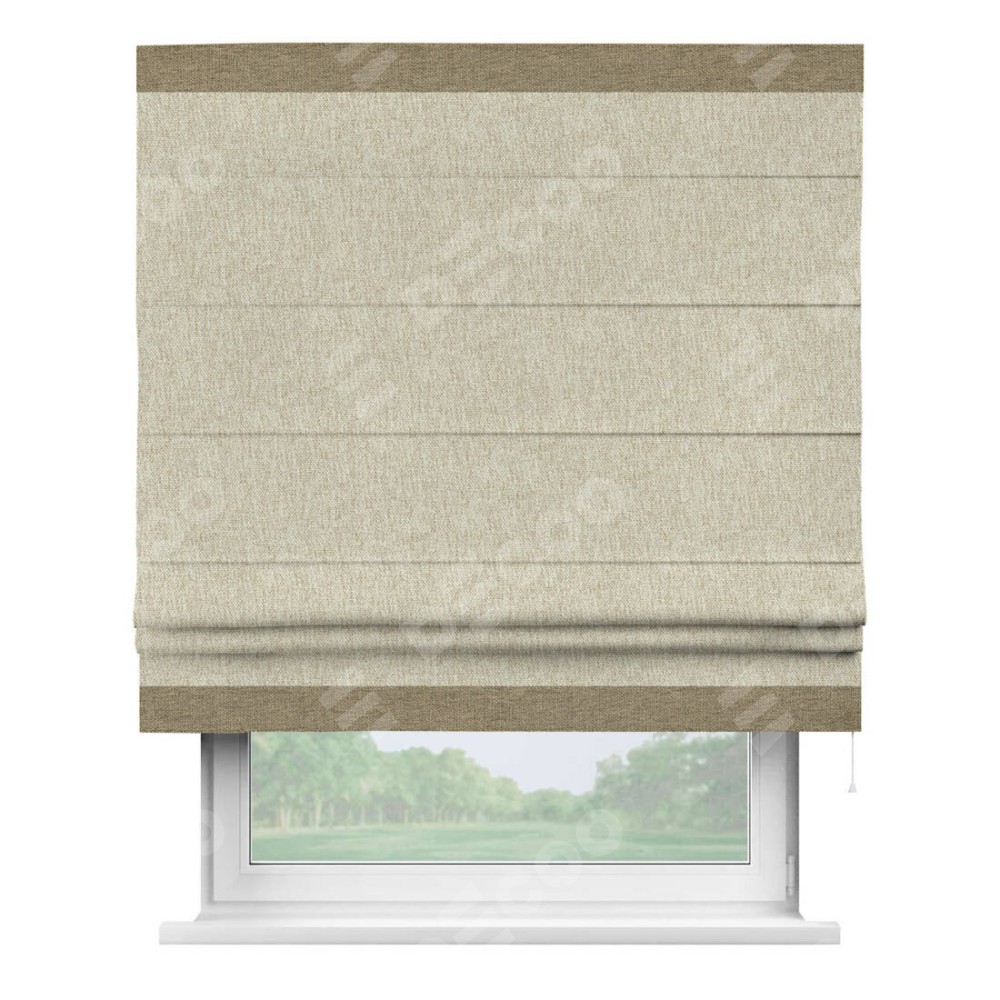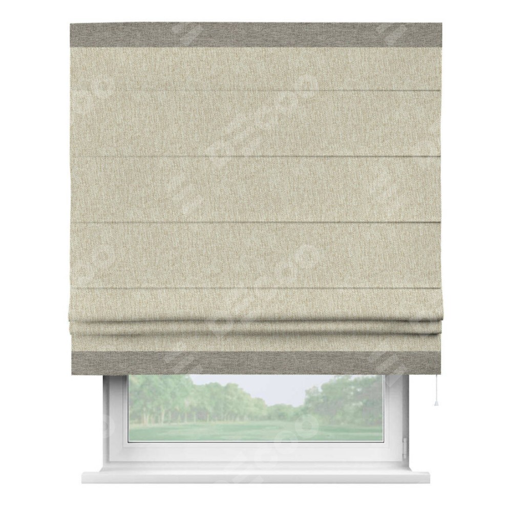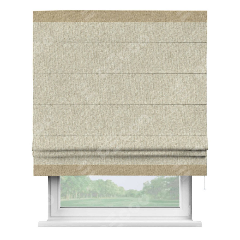 Римская штора производителя «Cortin», используется для проёма, пошита из ткани стиф димаут светло-бежевый, артикул 18084. Отделка шторы кантом «Горизонт», ткань для канта используется из стифа разной расцветки на выбор. Имеет универсальный механизм и подходит для монтажа: на потолок, на стену и в нишу.