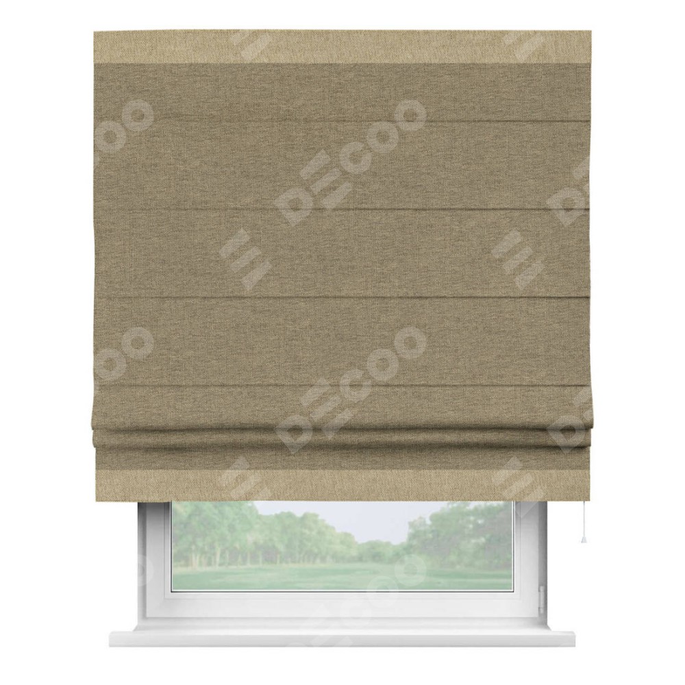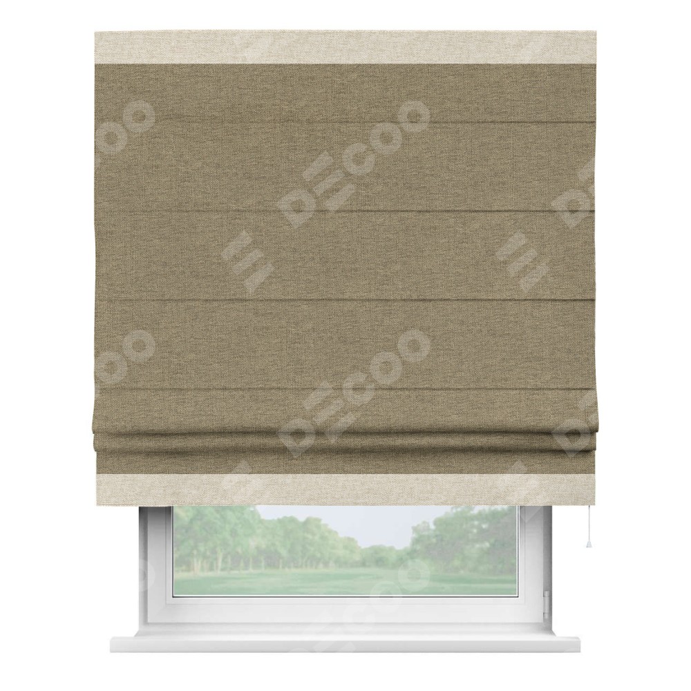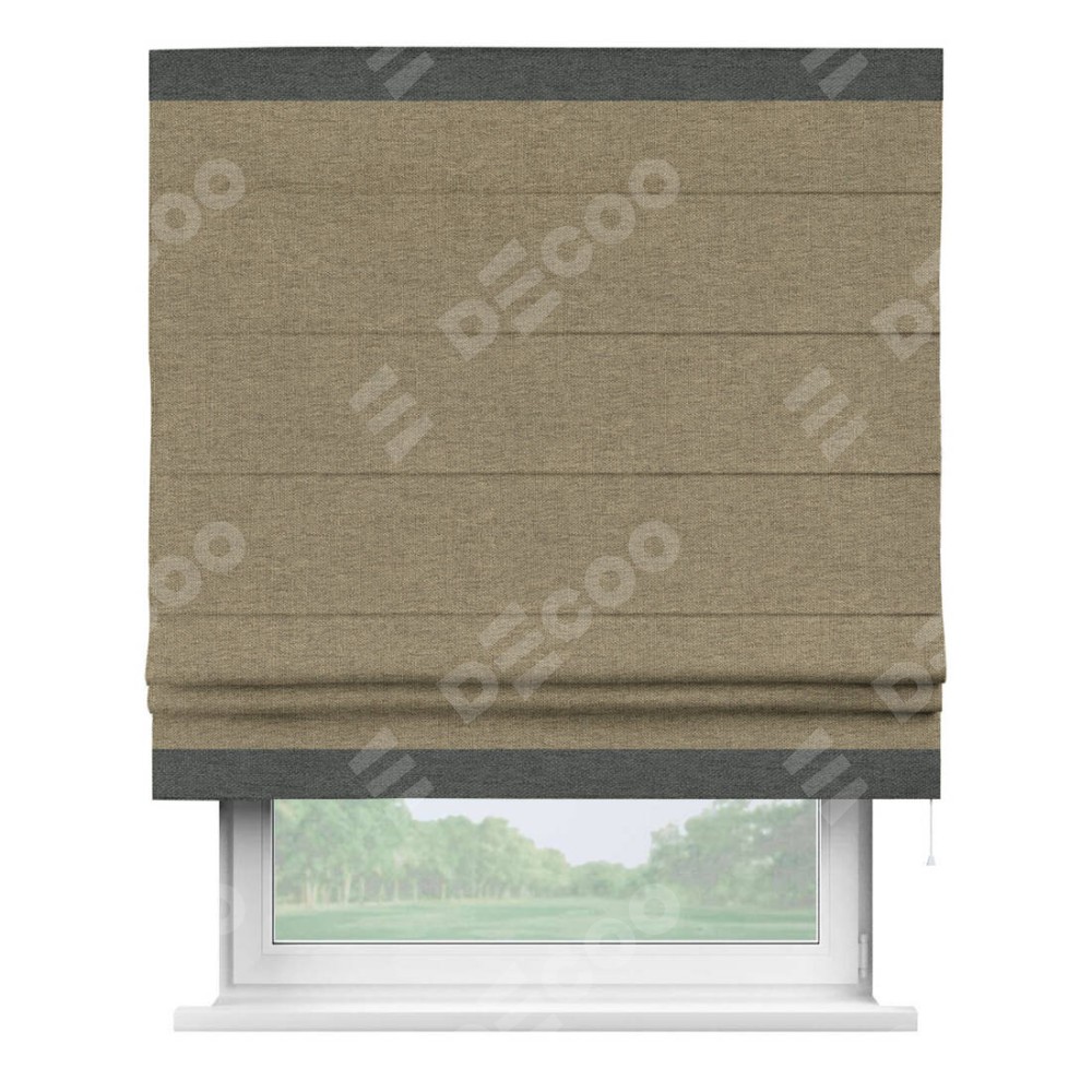 Римская штора производителя «Cortin», используется для проёма, пошита из ткани стиф димаут тёмно-бежевый, артикул 18085. Отделка шторы кантом «Горизонт», ткань для канта используется из стифа разной расцветки на выбор. Имеет универсальный механизм и подходит для монтажа: на потолок, на стену и в нишу.