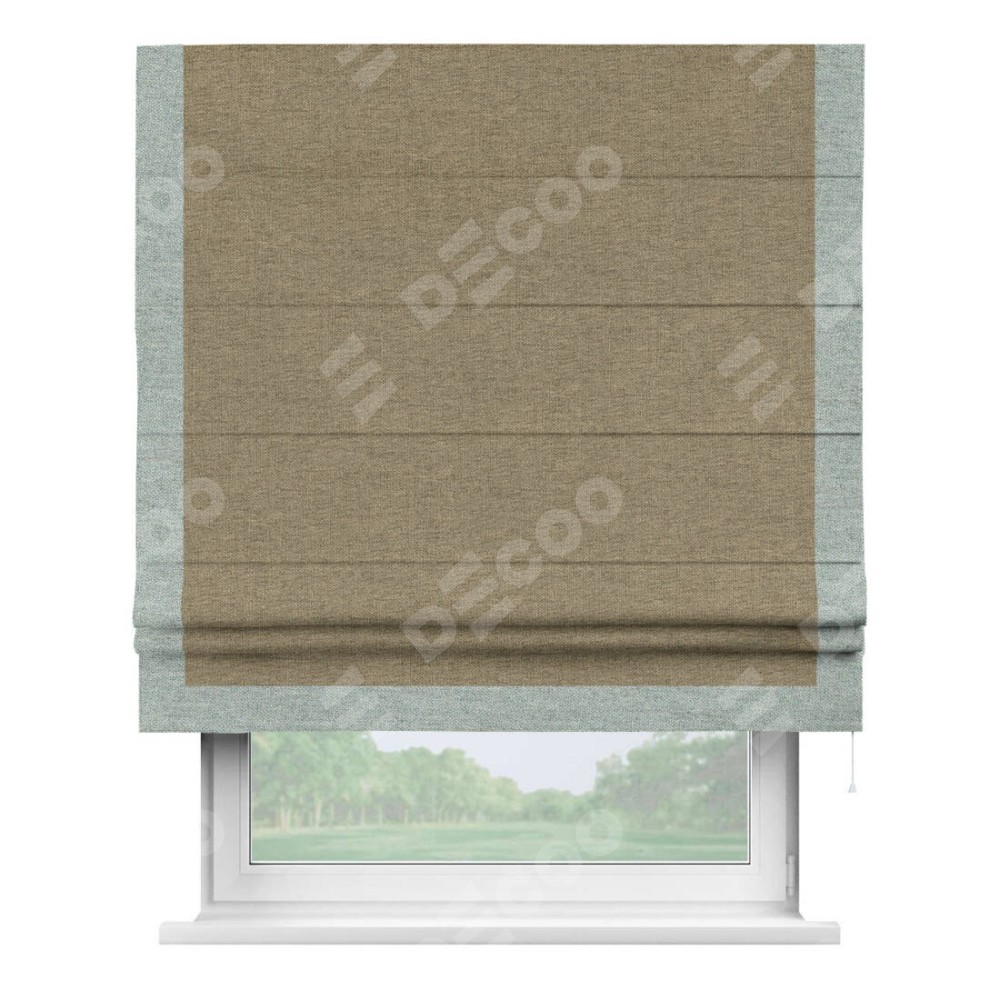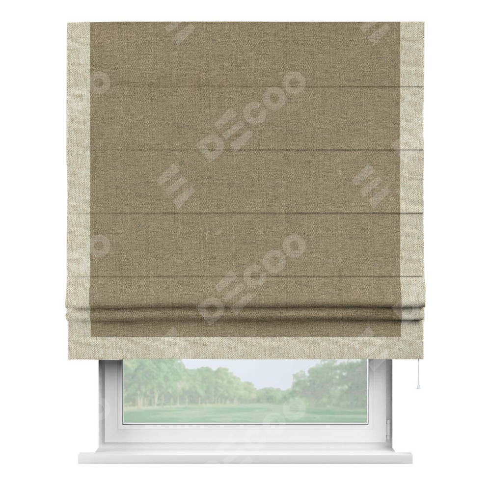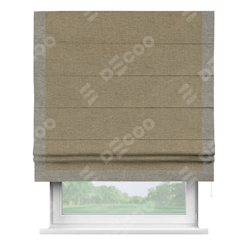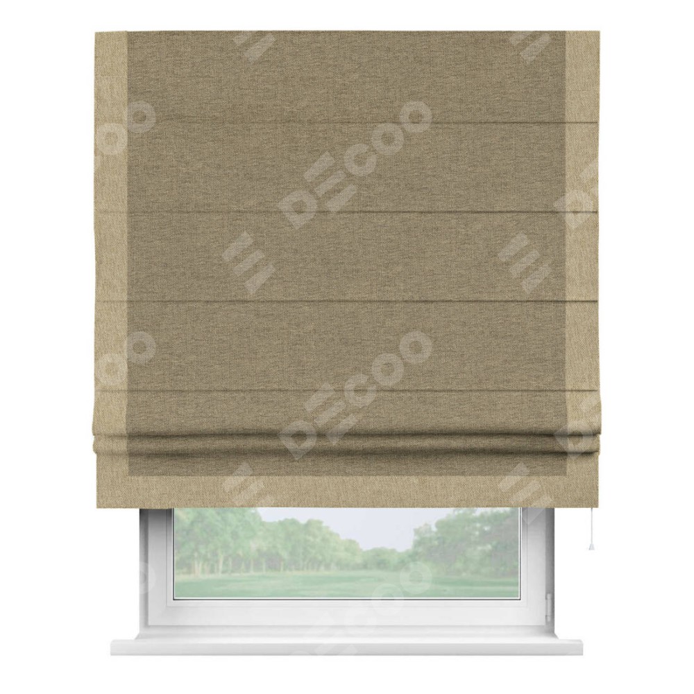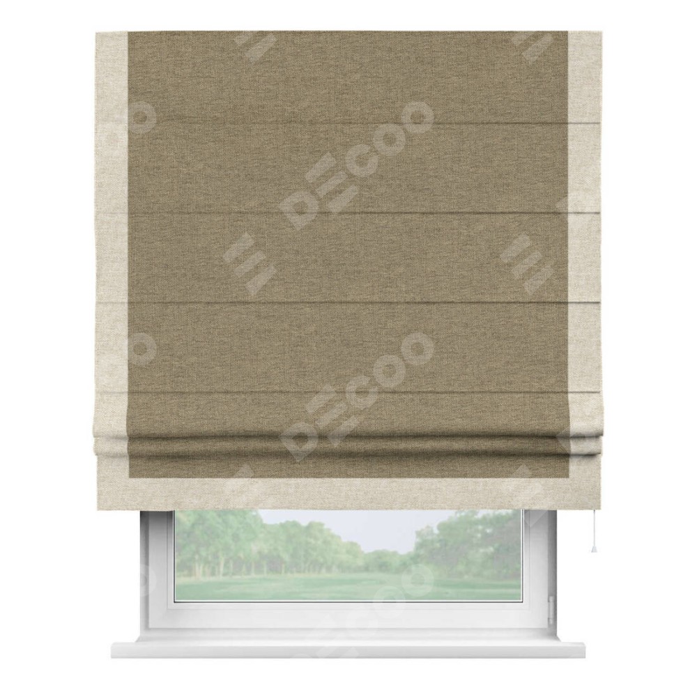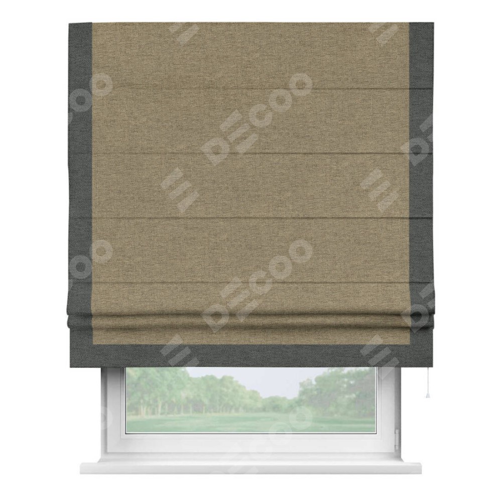 Римская штора производителя «Cortin», используется для проёма, пошита из ткани стиф димаут тёмно-бежевый, артикул 18085. Отделка шторы кантом «Виктория», ткань для канта используется из стифа разной расцветки на выбор. Имеет универсальный механизм и подходит для монтажа: на потолок, на стену и в нишу.