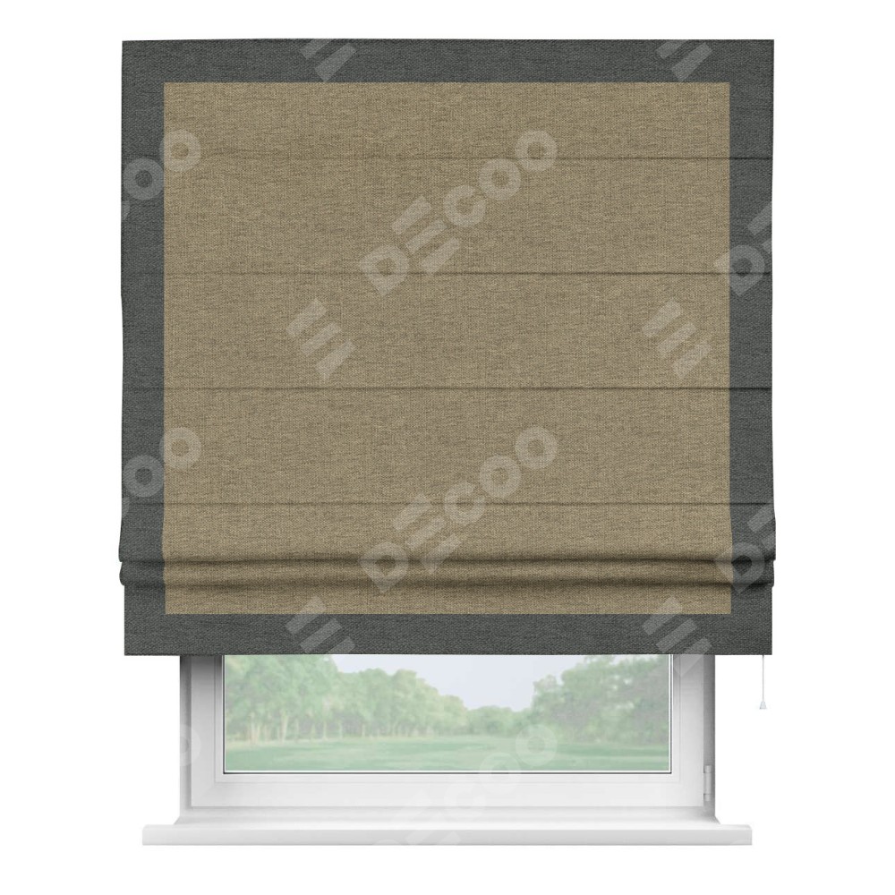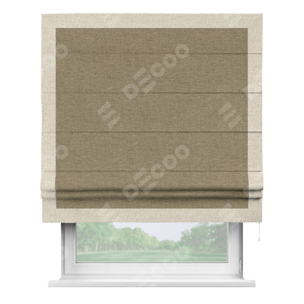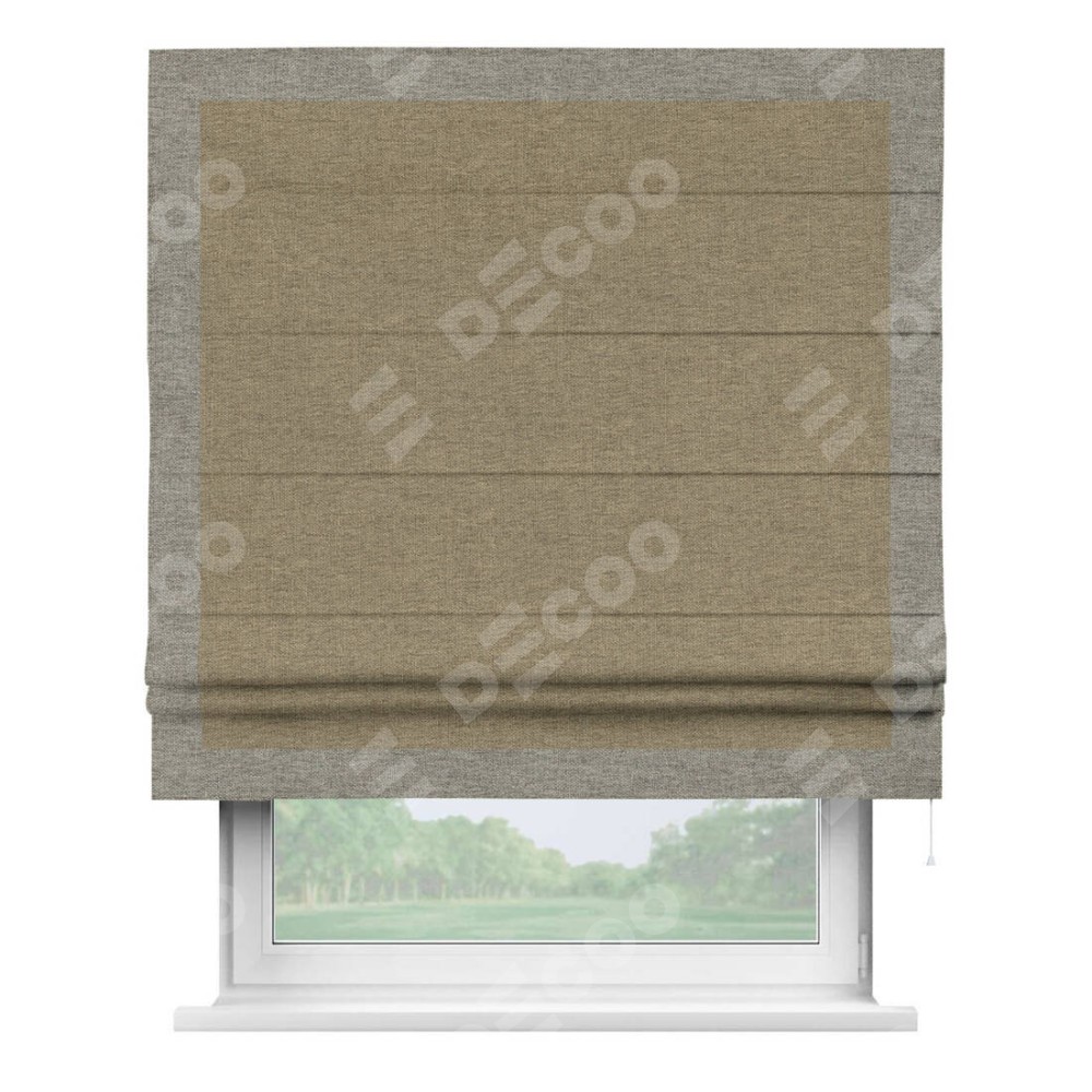 Римская штора производителя «Cortin», используется для проёма, пошита из ткани стиф димаут тёмно-бежевый, артикул 18085. Отделка шторы кантом «Чесс», ткань для канта используется из стифа разной расцветки на выбор. Имеет универсальный механизм и подходит для монтажа: на потолок, на стену и в нишу.