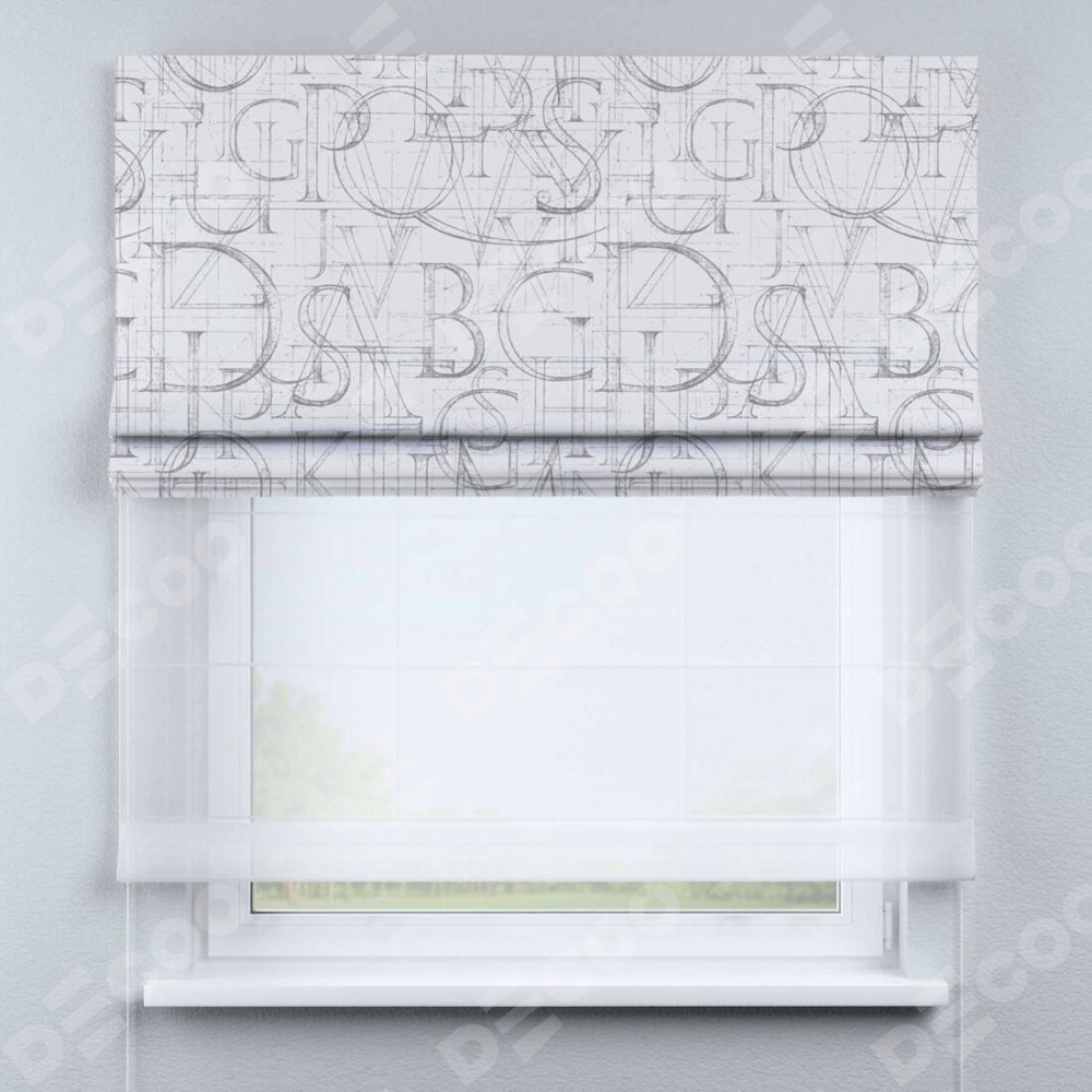 Римская штора день-ночь производителя «Cortin», используется для проёма, пошита из двух полотен, с лицевой блэкаут с нанесением сублимационной печати «Античные буквы», вторая ткань тюль (по стандарту комплектуется тюль белого цвета артикул V-01). Имеет универсальный механизм и подходит для монтажа: на потолок, на стену и в нишу.