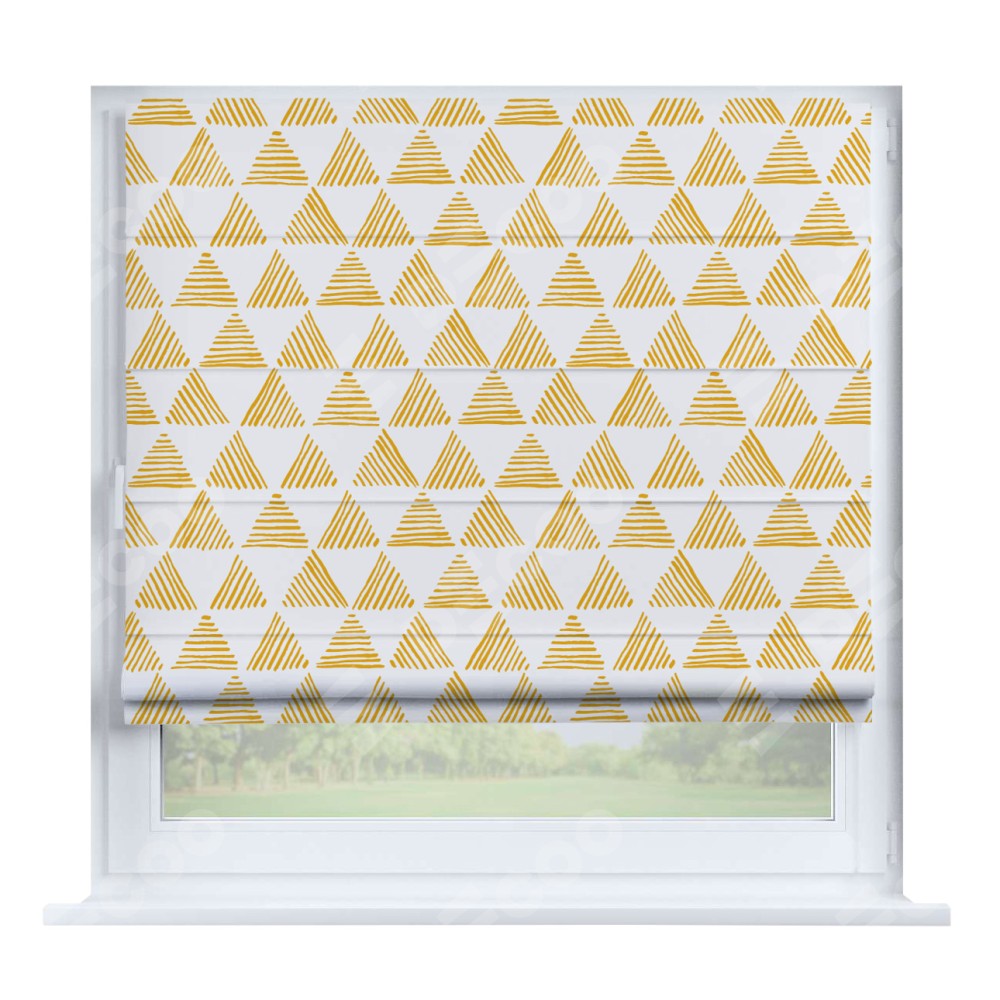 Римская штора производителя «Cortin», устанавливается на створку окна, пошита из ткани блэкаут с нанесением сублимационной печати «Желтые треугольники». Штора шьётся по индивидуальным размерам, для данного типа римской шторы возможная ширина от 35 до 150 см., высота до 250 см.