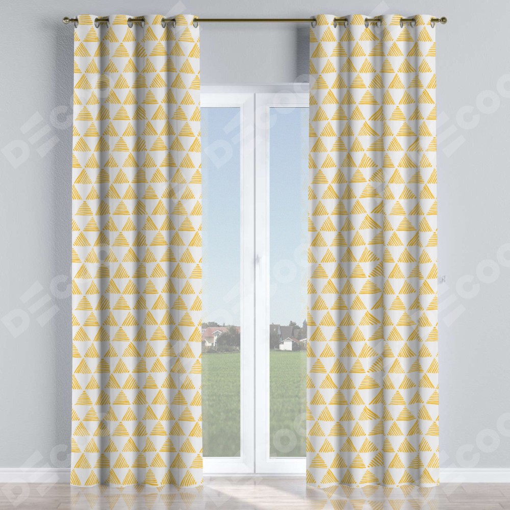 Комплект прямых штор, от производителя «Cortin», пошиты из ткани блэкаут с нанесением сублимационной печати «Желтые треугольники». Данная модель пошита на люверсах, комплектуется на выбор круглым карнизом и подходит для монтажа на стену или потолок. Прямые шторы на люверсах шьются по стандарту с коэффициентом 1/2 (на 100 см. ширины проёма 200 см. ширины ткани), отличительным преимуществом данной модели является простой способ монтажа. Достаточно повесить ее на трубу и штора готова!