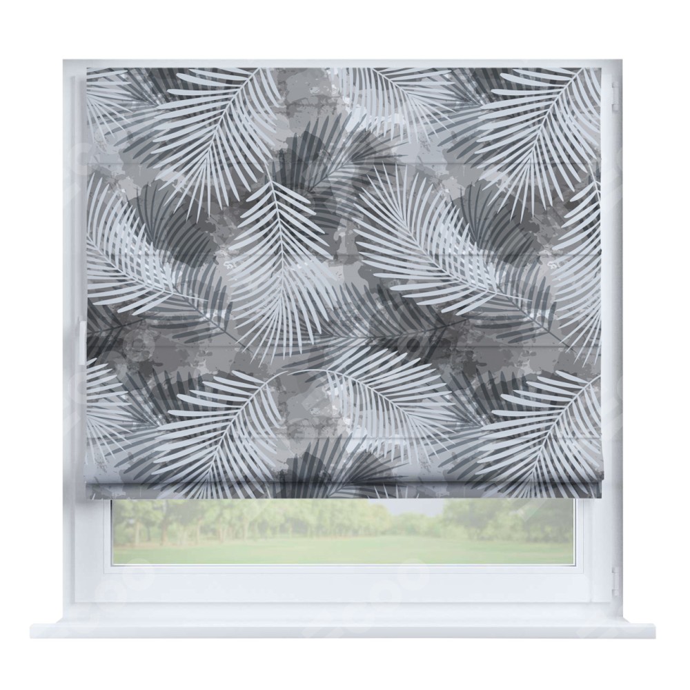 Римская штора производителя «Cortin», устанавливается на створку окна, пошита из ткани блэкаут с нанесением сублимационной печати «Листья в тени». Штора шьётся по индивидуальным размерам, для данного типа римской шторы возможная ширина от 35 до 150 см., высота до 250 см.