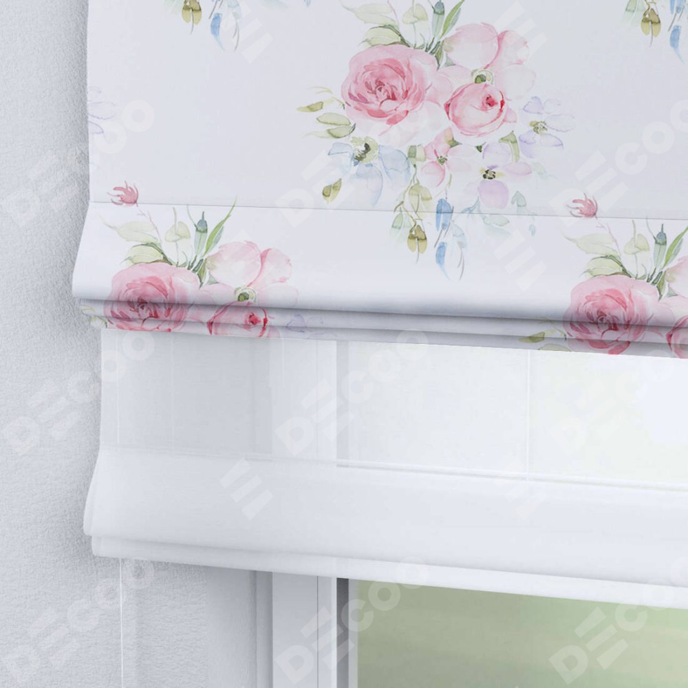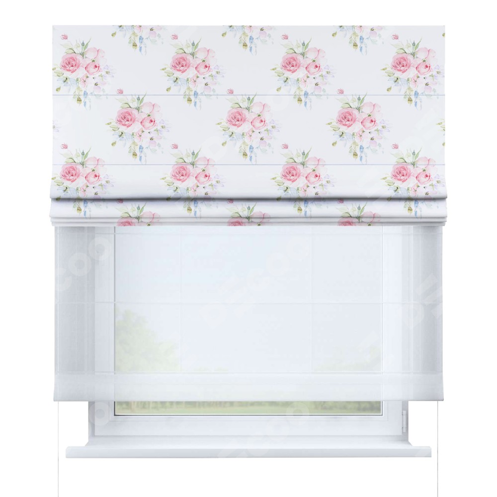 Римская штора день-ночь производителя «Cortin», используется для проёма, пошита из двух полотен, с лицевой блэкаут с нанесением сублимационной печати «Нежный розарий», вторая ткань тюль (по стандарту комплектуется тюль белого цвета артикул V-01). Имеет универсальный механизм и подходит для монтажа: на потолок, на стену и в нишу.