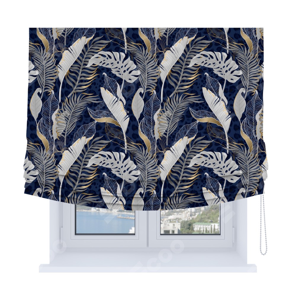 Римская штора Soft с мягкими складками, «Сине-золотые джунгли»