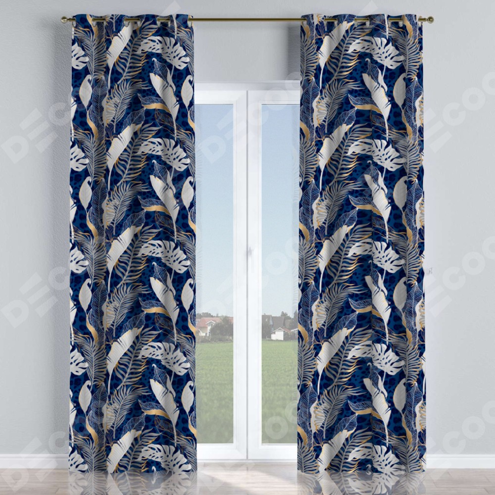 Комплект прямых штор, от производителя «Cortin», пошиты из ткани блэкаут с нанесением сублимационной печати «Сине-золотые джунгли». Данная модель пошита на люверсах, комплектуется на выбор круглым карнизом и подходит для монтажа на стену или потолок. Прямые шторы на люверсах шьются по стандарту с коэффициентом 1/2 (на 100 см. ширины проёма 200 см. ширины ткани), отличительным преимуществом данной модели является простой способ монтажа. Достаточно повесить ее на трубу и штора готова!