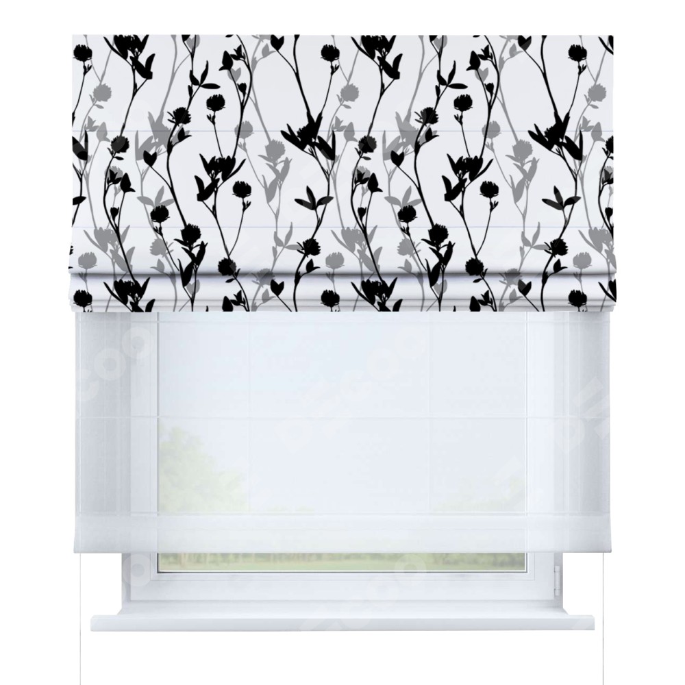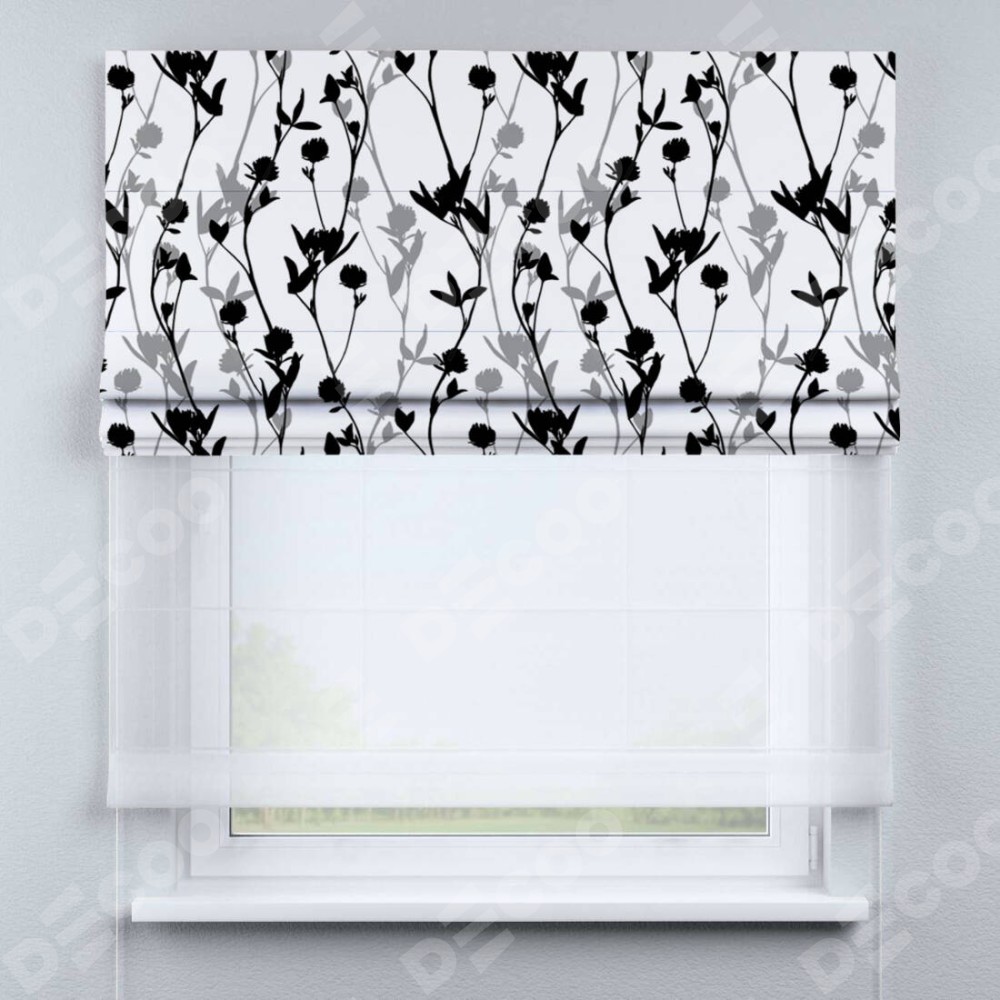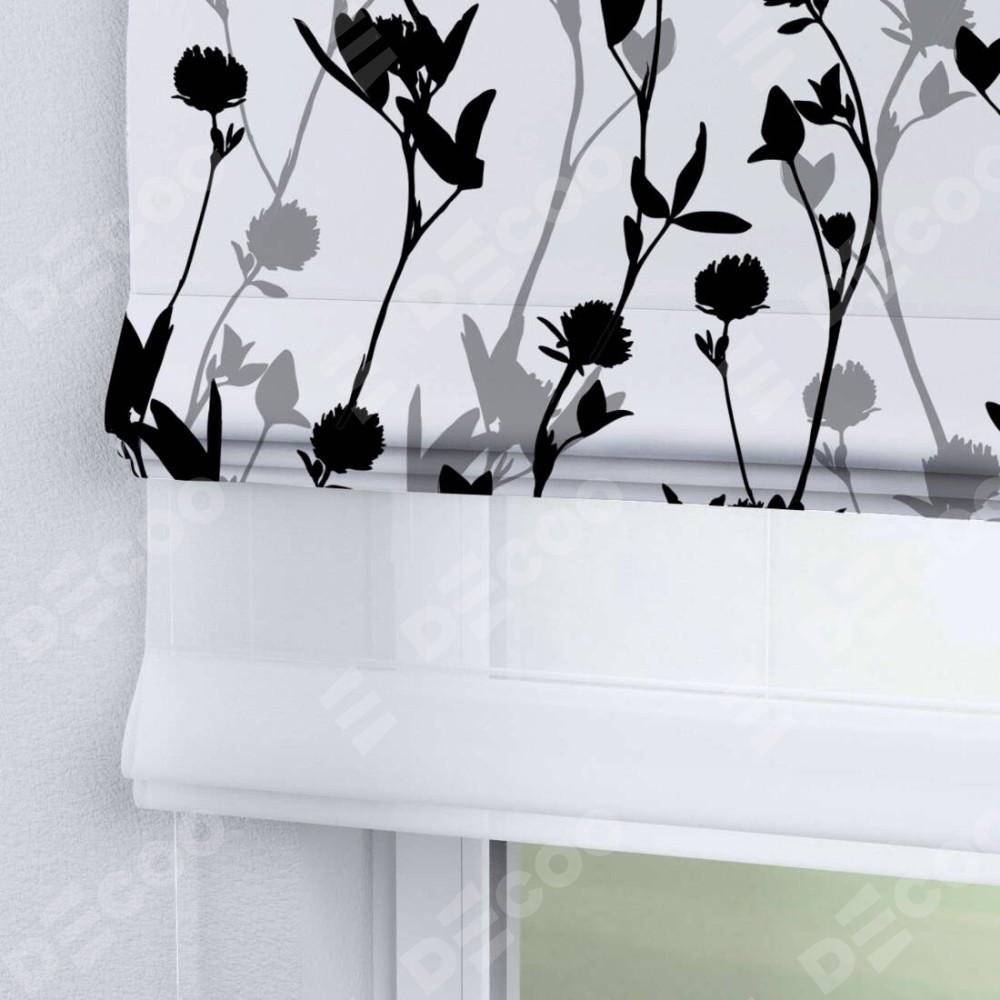 Римская штора день-ночь производителя «Cortin», используется для проёма, пошита из двух полотен, с лицевой блэкаут с нанесением сублимационной печати «Цветочный силуэт», вторая ткань тюль (по стандарту комплектуется тюль белого цвета артикул V-01). Имеет универсальный механизм и подходит для монтажа: на потолок, на стену и в нишу.
