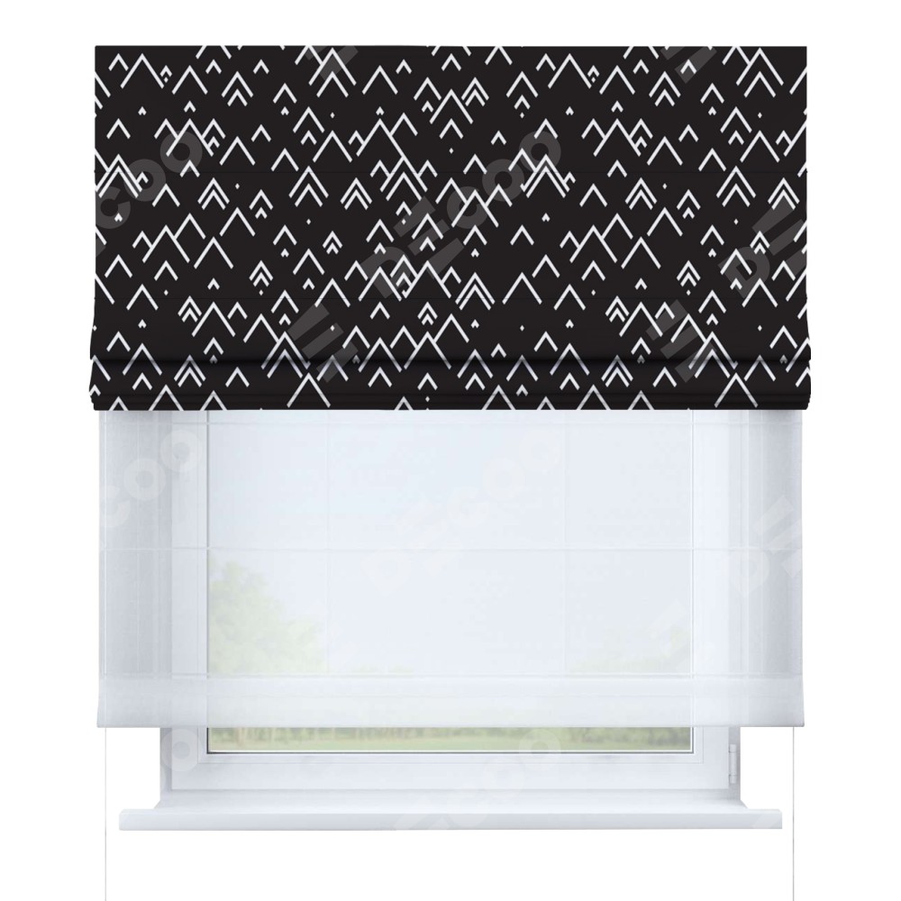 Римская штора день-ночь производителя «Cortin», используется для проёма, пошита из двух полотен, с лицевой блэкаут с нанесением сублимационной печати «Черно-белый минимализм», вторая ткань тюль (по стандарту комплектуется тюль белого цвета артикул V-01). Имеет универсальный механизм и подходит для монтажа: на потолок, на стену и в нишу.