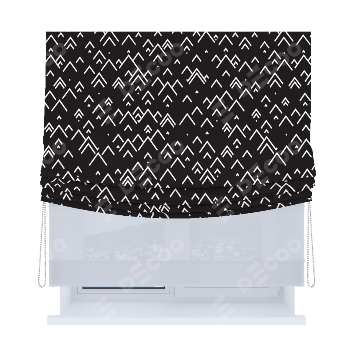 Римская штора день-ночь производителя «Cortin», используется для проёма, пошита из двух полотен, с лицевой блэкаут с нанесением сублимационной печати «Черно-белый минимализм», вторая ткань тюль (по стандарту комплектуется тюль белого цвета артикул V-01). Имеет универсальный механизм и подходит для монтажа: на потолок, на стену и в нишу. Удобное управление каждой шторой отдельно.