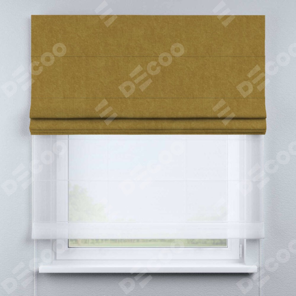 Римская штора день-ночь производителя «Cortin», используется для проёма, пошита из двух полотен, с лицевой стороны канвас горчица артикул v-476, вторая ткань тюль (по стандарту комплектуется тюль белого цвета артикул V-01). Имеет универсальный механизм и подходит для монтажа: на потолок, на стену и в нишу.