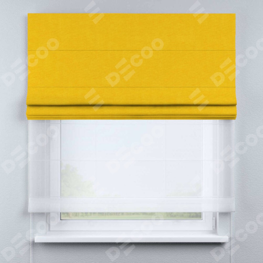 Римская штора день-ночь производителя «Cortin», используется для проёма, пошита из двух полотен, с лицевой стороны канвас желтый артикул v-344, вторая ткань тюль (по стандарту комплектуется тюль белого цвета артикул V-01). Имеет универсальный механизм и подходит для монтажа: на потолок, на стену и в нишу.