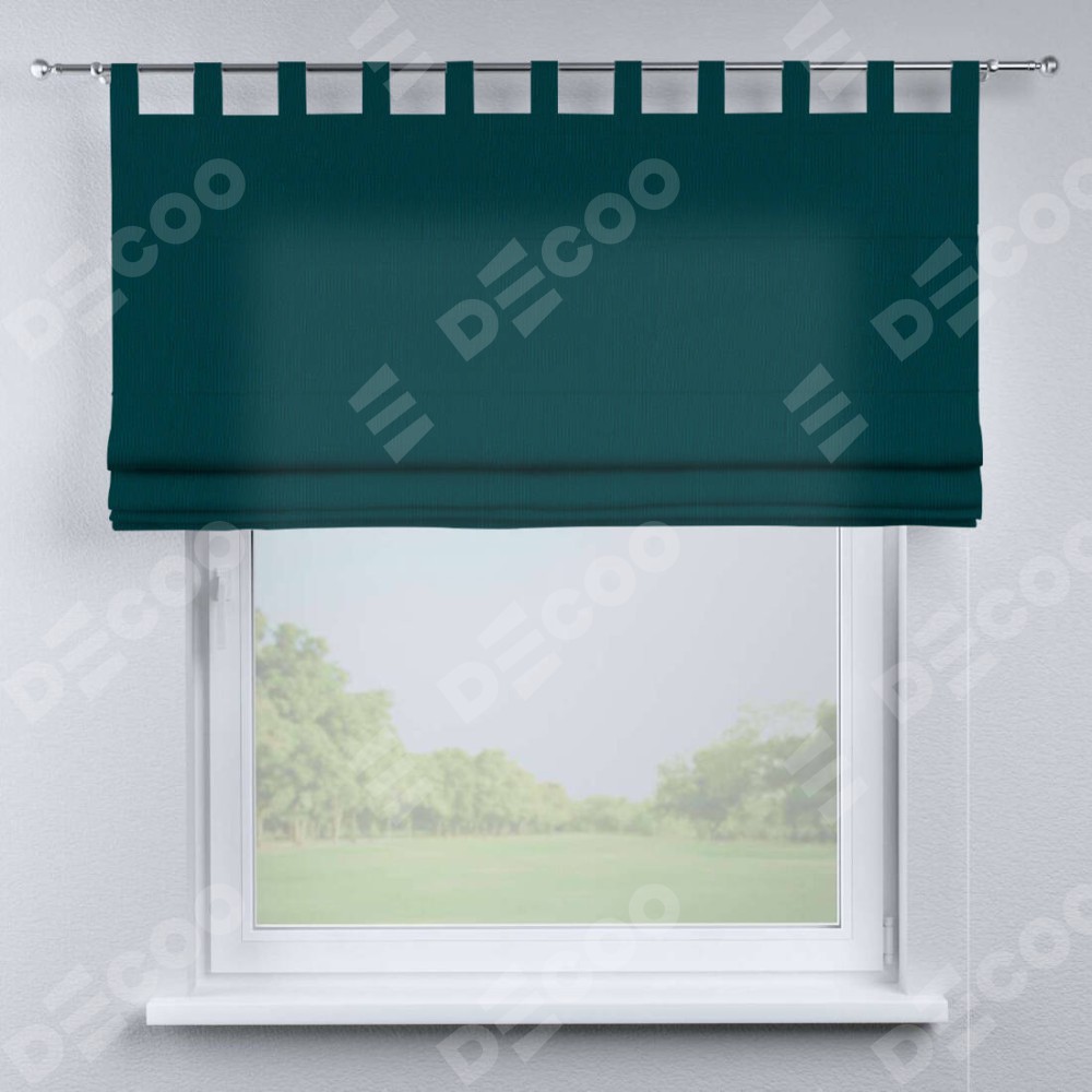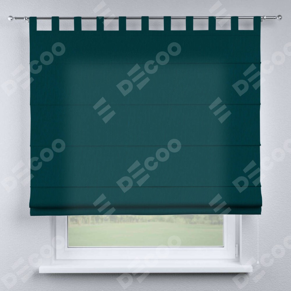 Римская штора производителя «Cortin», используется для проёма, пошита из ткани канвас изумрудный, артикул ткани v-12487. Данная модель пошита на петлях, комплектуется на выбор круглым карнизом и подходит для монтажа на стену. Римская штора на петлях имеет простую систему регулировки высоты, отличительным преимуществом данной модели является простой способ монтажа. Достаточно повесить ее на трубу и штора готова!