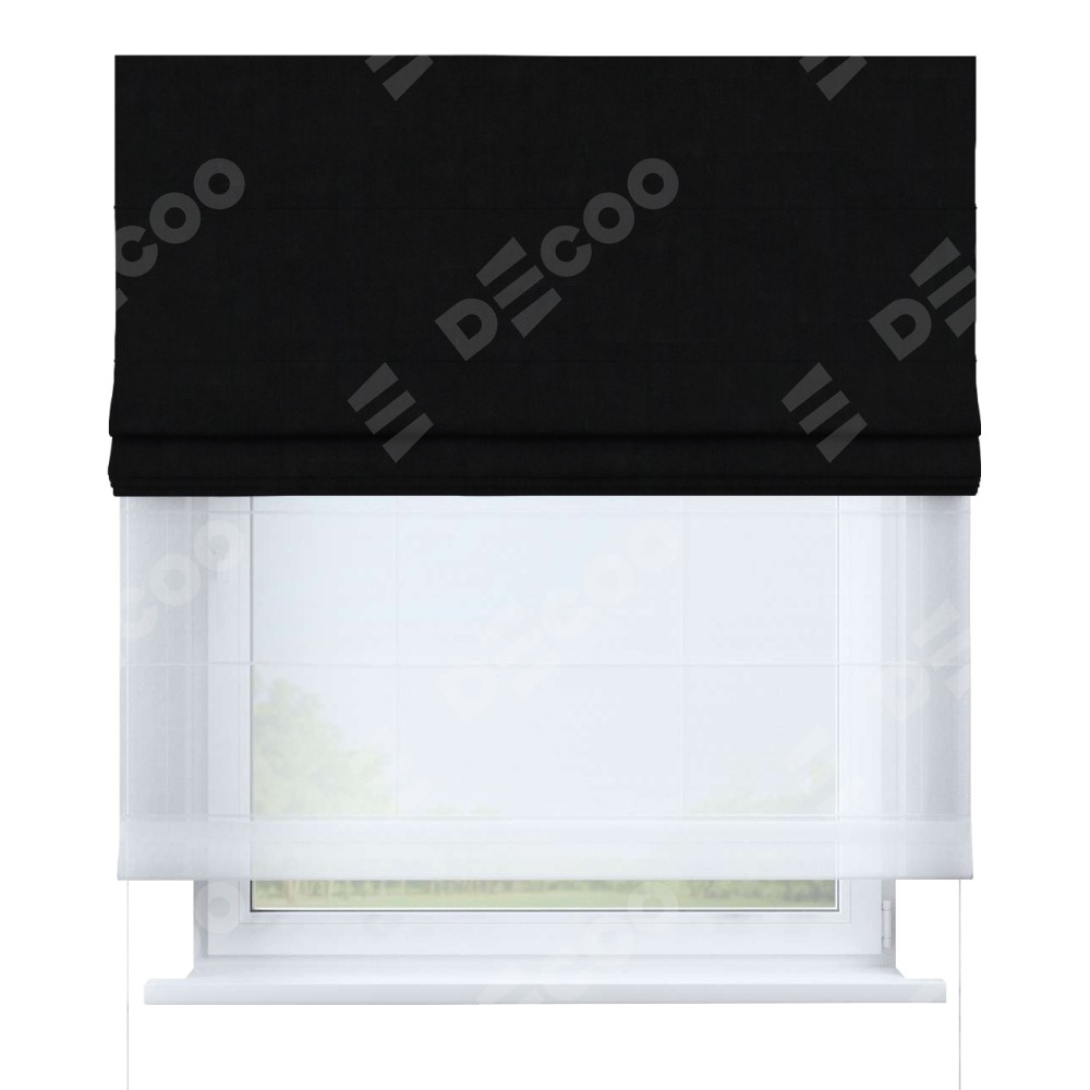 Римская штора день-ночь производителя «Cortin», используется для проёма, пошита из двух полотен, с лицевой стороны канвас канвас черный v-194, вторая ткань тюль (по стандарту комплектуется тюль белого цвета артикул V-01). Имеет универсальный механизм и подходит для монтажа: на потолок, на стену и в нишу.