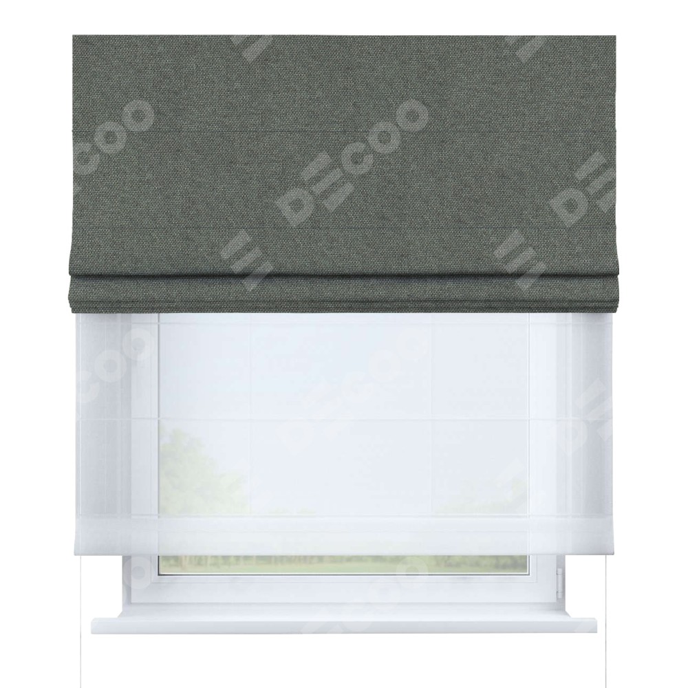 Римская штора день-ночь производителя «Cortin», используется для проёма, пошита из двух полотен, с лицевой стороны лён димаут тёмно-серый артикул 91011, вторая ткань тюль (по стандарту комплектуется тюль белого цвета артикул V-01). Имеет универсальный механизм и подходит для монтажа: на потолок, на стену и в нишу.