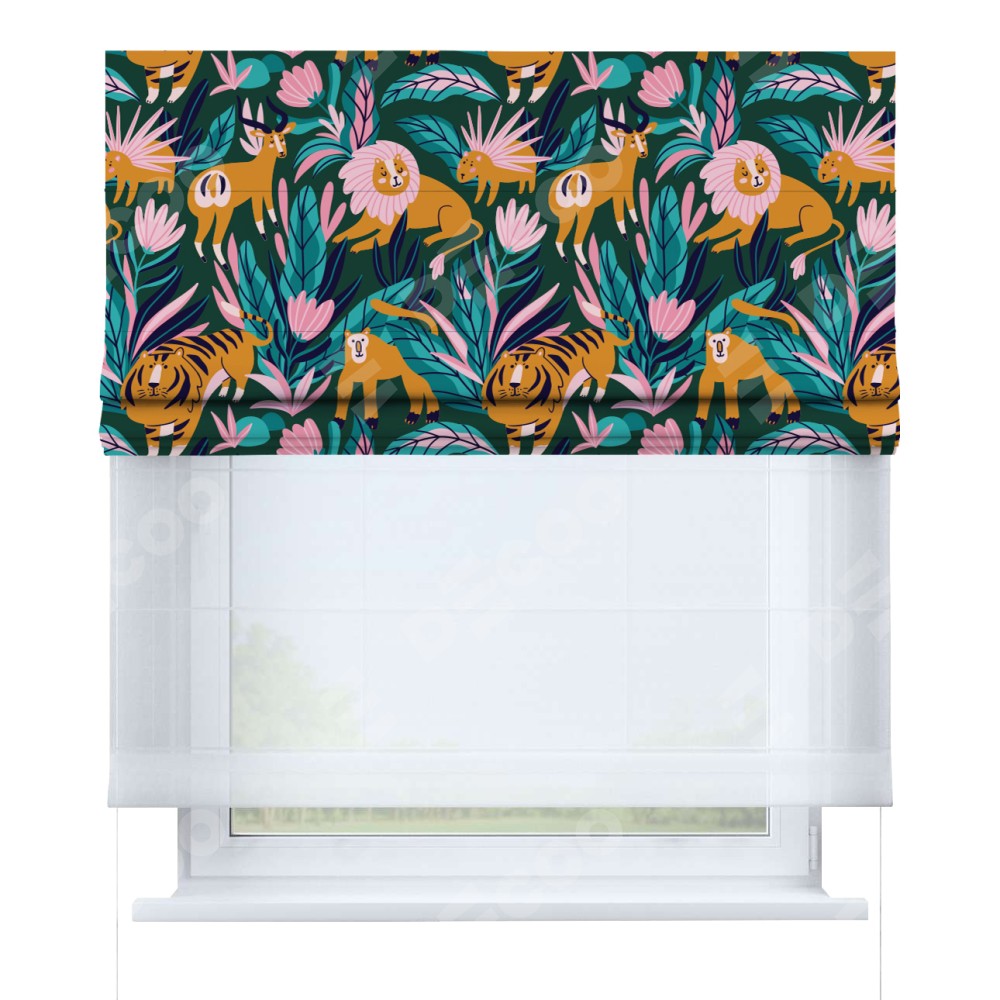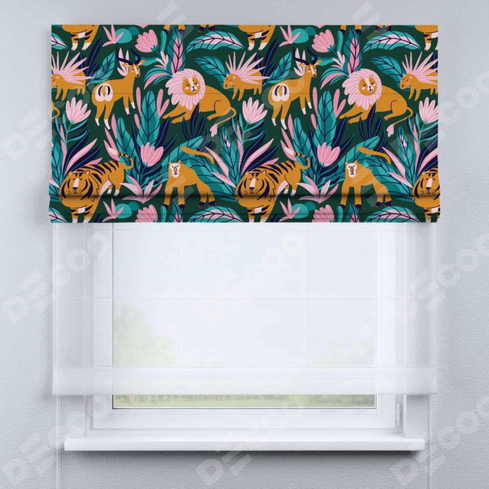 Римская штора день-ночь производителя «Cortin», используется для проёма, пошита из двух полотен, с лицевой блэкаут с нанесением сублимационной печати «Дикие животные», вторая ткань тюль (по стандарту комплектуется тюль белого цвета артикул V-01). Имеет универсальный механизм и подходит для монтажа: на потолок, на стену и в нишу.