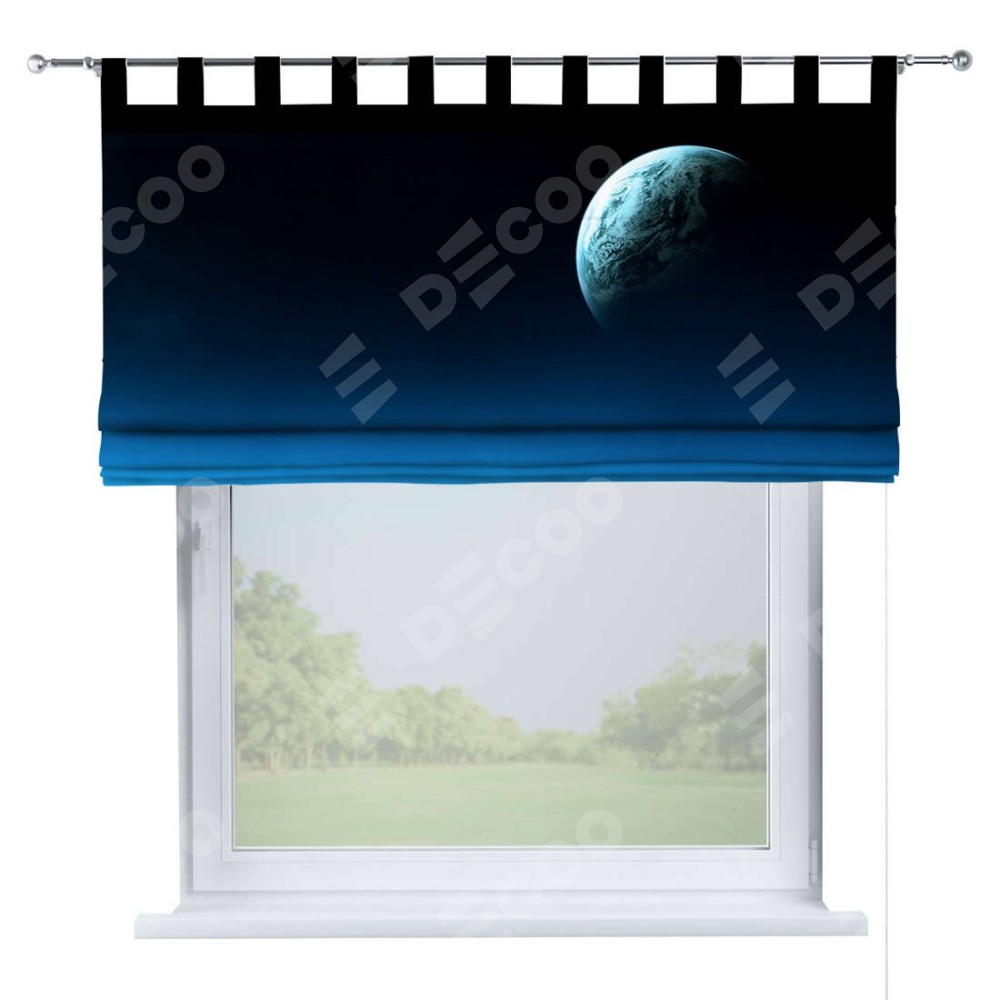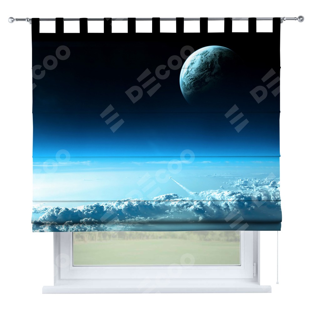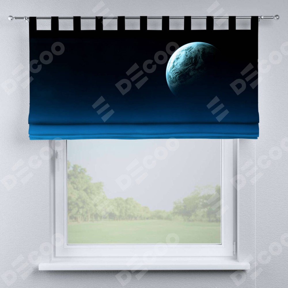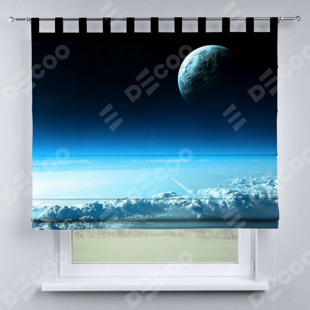 Римская штора производителя «Cortin», используется для проёма, пошита из ткани блэкаут с нанесением сублимационной печати «Горизонты вселенной». Данная модель пошита на петлях, комплектуется на выбор круглым карнизом и подходит для монтажа на стену. Римская штора на петлях имеет простую систему регулировки высоты, отличительным преимуществом данной модели является простой способ монтажа. Достаточно повесить ее на трубу и штора готова!