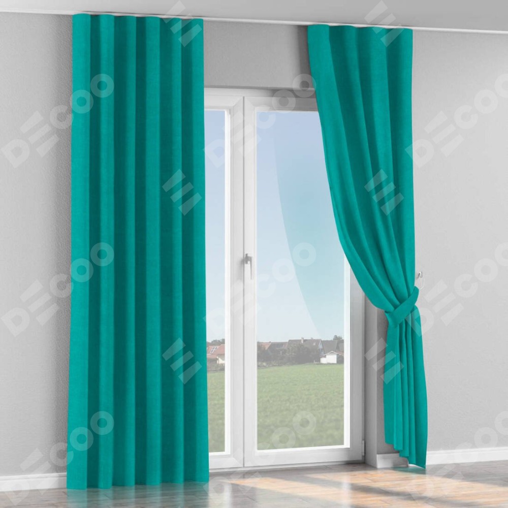 Комплект прямых штор, от производителя «Cortin», пошиты из ткани канвас бирюзовый, артикул ткани v-1048. С изнаночной стороны в верхней части штор пристрачивается шторная лента с декоративными складками «Волна». Для создания элегантных складок прямые шторы шьются по стандарту с коэффициентом 1:2 (на 100 см. ширины проёма 200 см. ширины ткани).