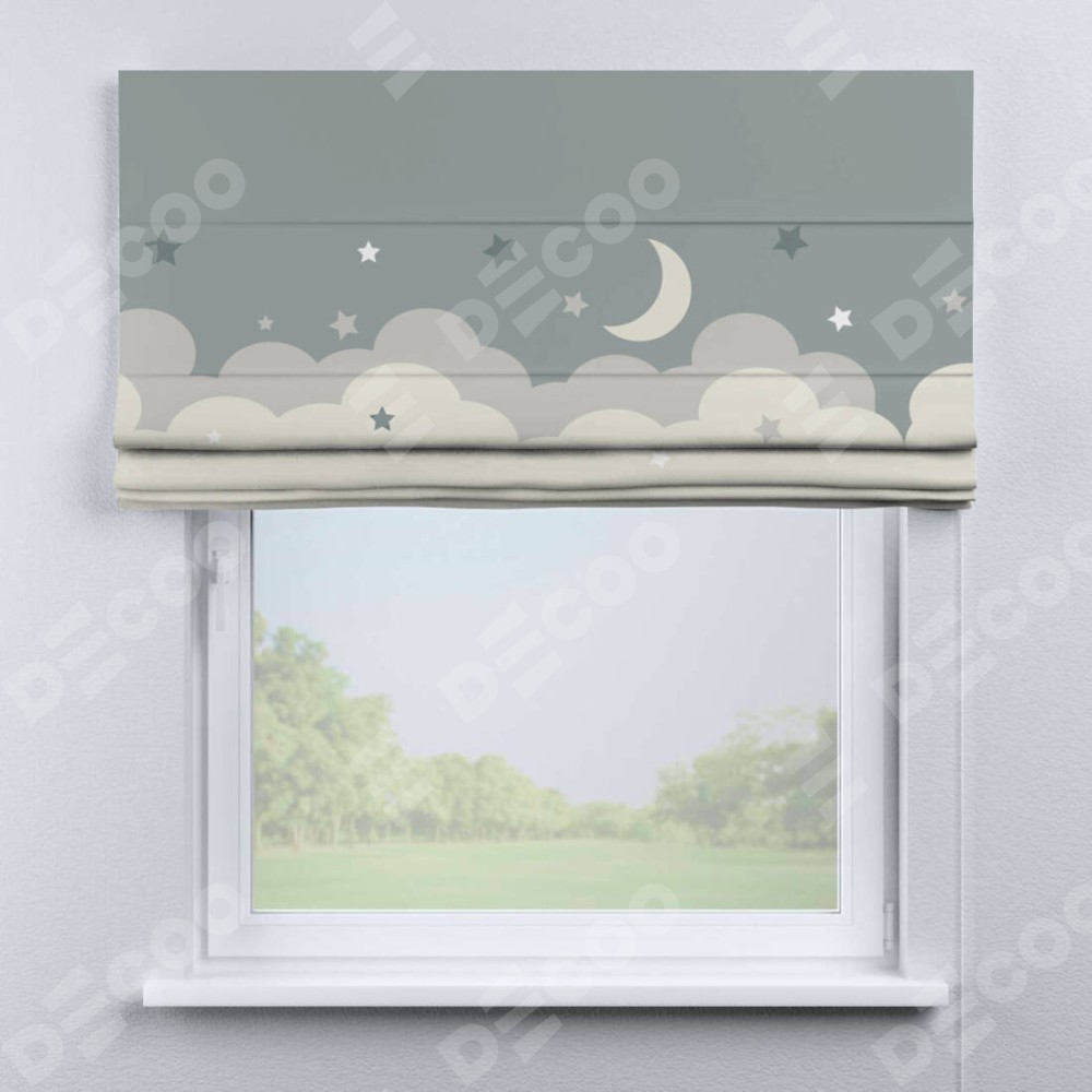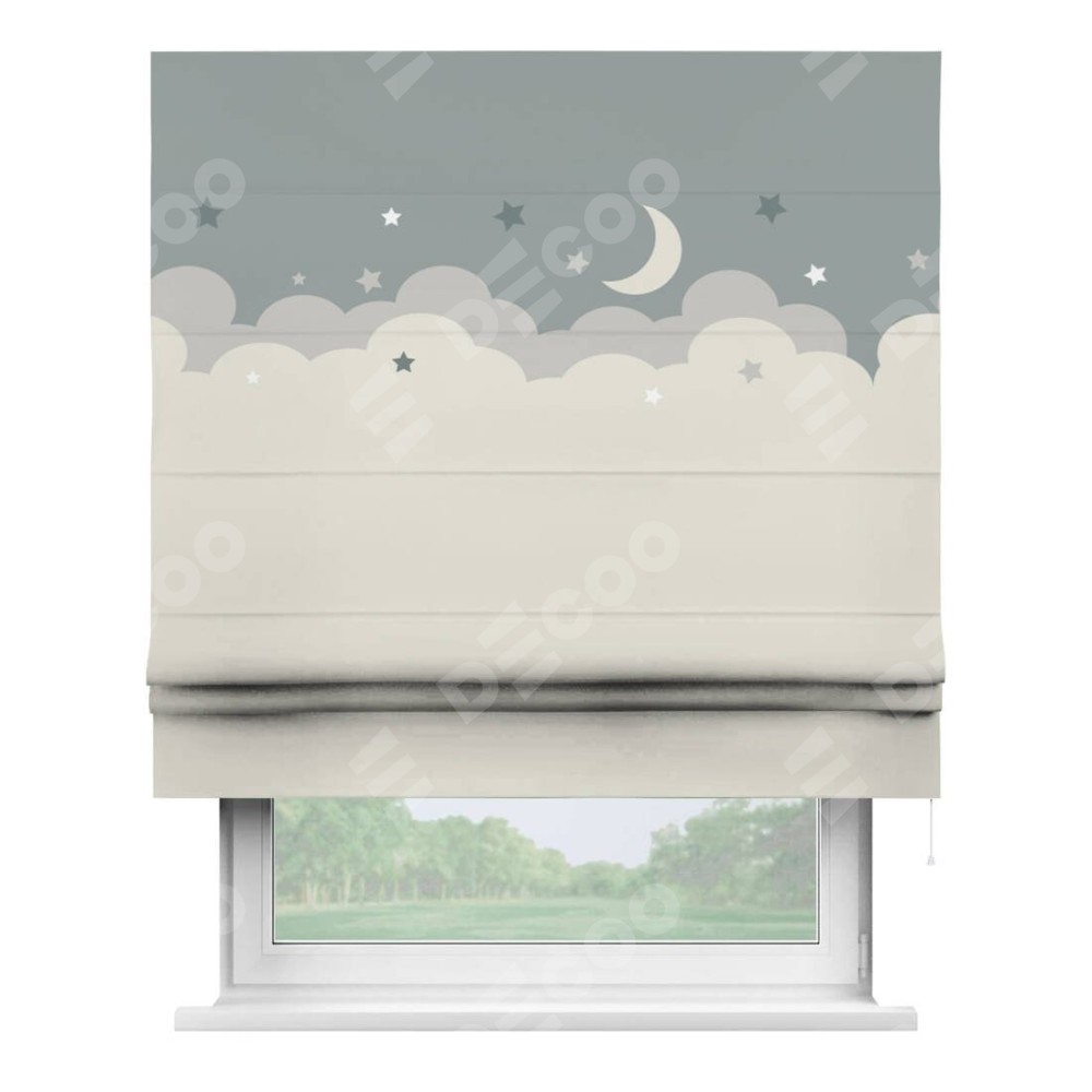 Римская штора производителя «Cortin», используется для проёма, пошита из ткани блэкаут с нанесением сублимационной печати «Ночные облака». Имеет универсальный механизм и подходит для монтажа: на потолок, на стену и в нишу.