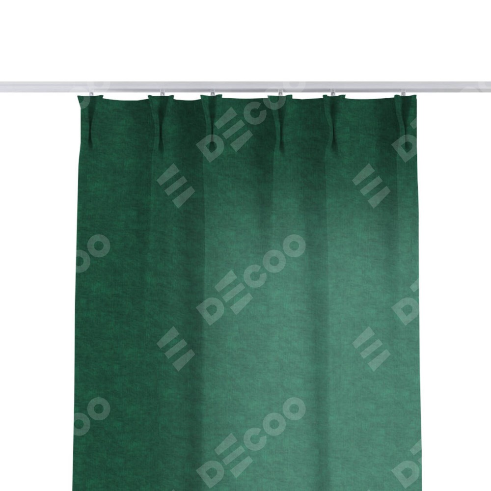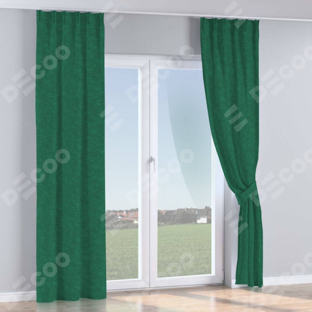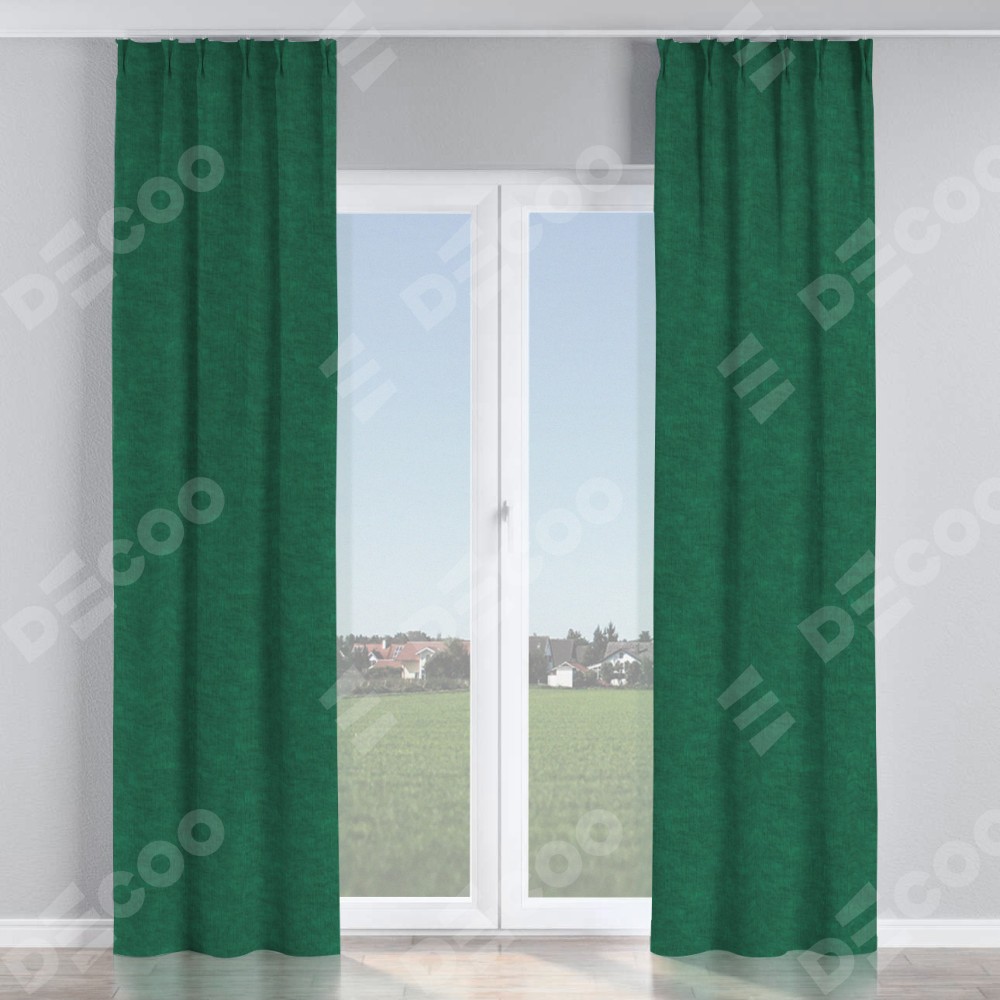 Комплект прямых штор, от производителя «Cortin», пошиты из ткани канвас тёмно-зелёный, артикул ткани v-469. С изнаночной стороны в верхней части штор пристрачивается шторная лента с декоративными складками «Кустик». Для создания элегантных складок прямые шторы шьются по стандарту с коэффициентом 1:2 (на 100 см. ширины проёма 200 см. ширины ткани).