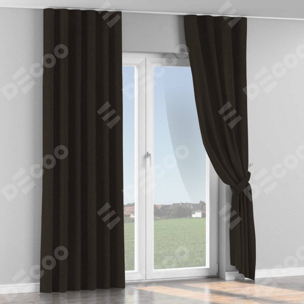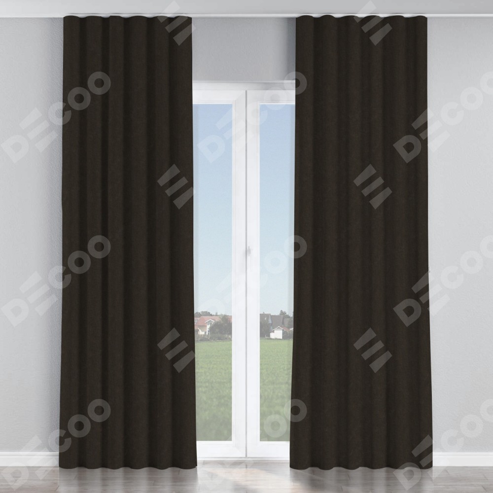 Комплект прямых штор, от производителя «Cortin», пошиты из ткани канвас тёмно-коричневый, артикул ткани v-13. С изнаночной стороны в верхней части штор пристрачивается шторная лента с декоративными складками «Волна». Для создания элегантных складок прямые шторы шьются по стандарту с коэффициентом 1:2 (на 100 см. ширины проёма 200 см. ширины ткани).
