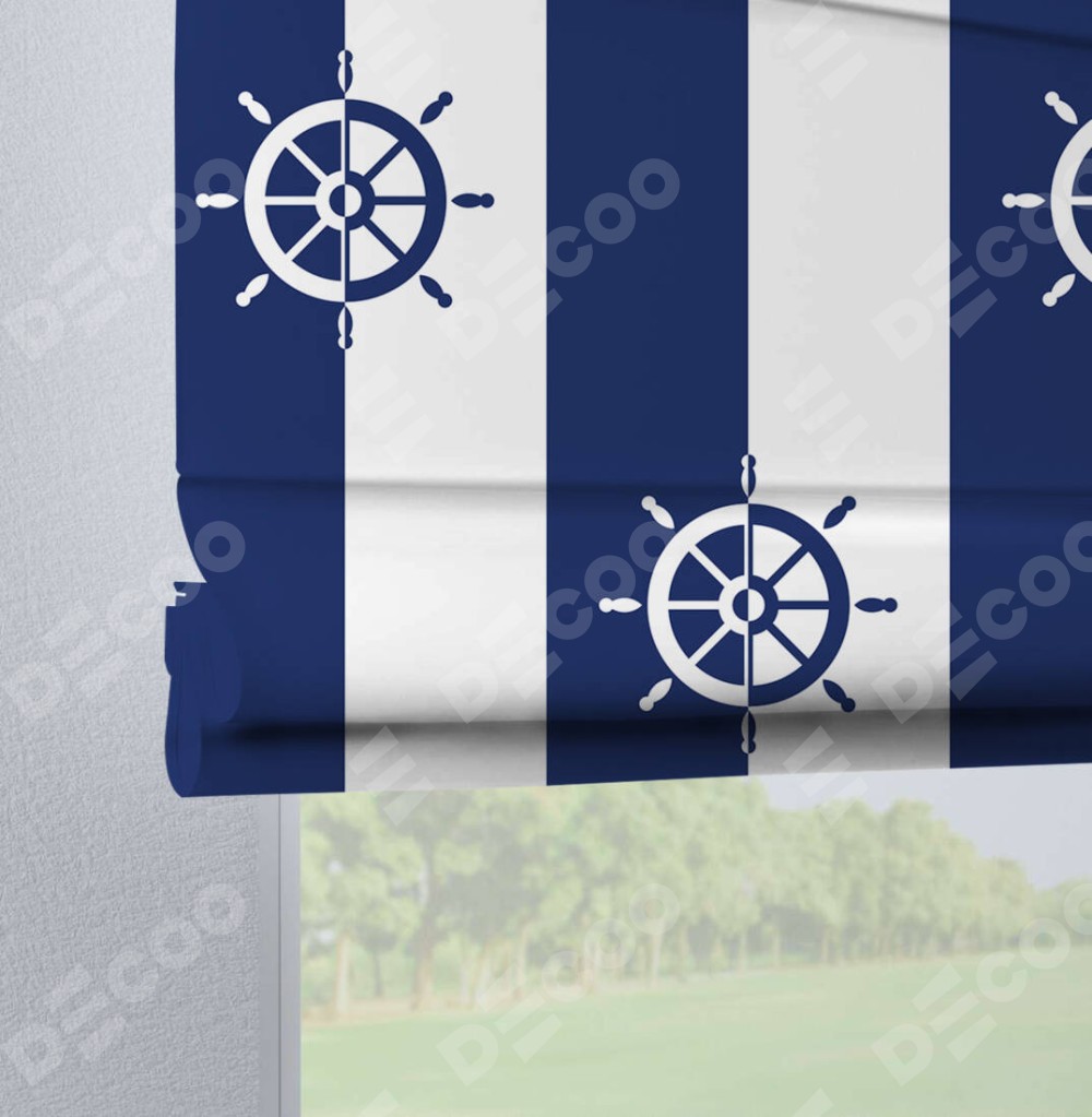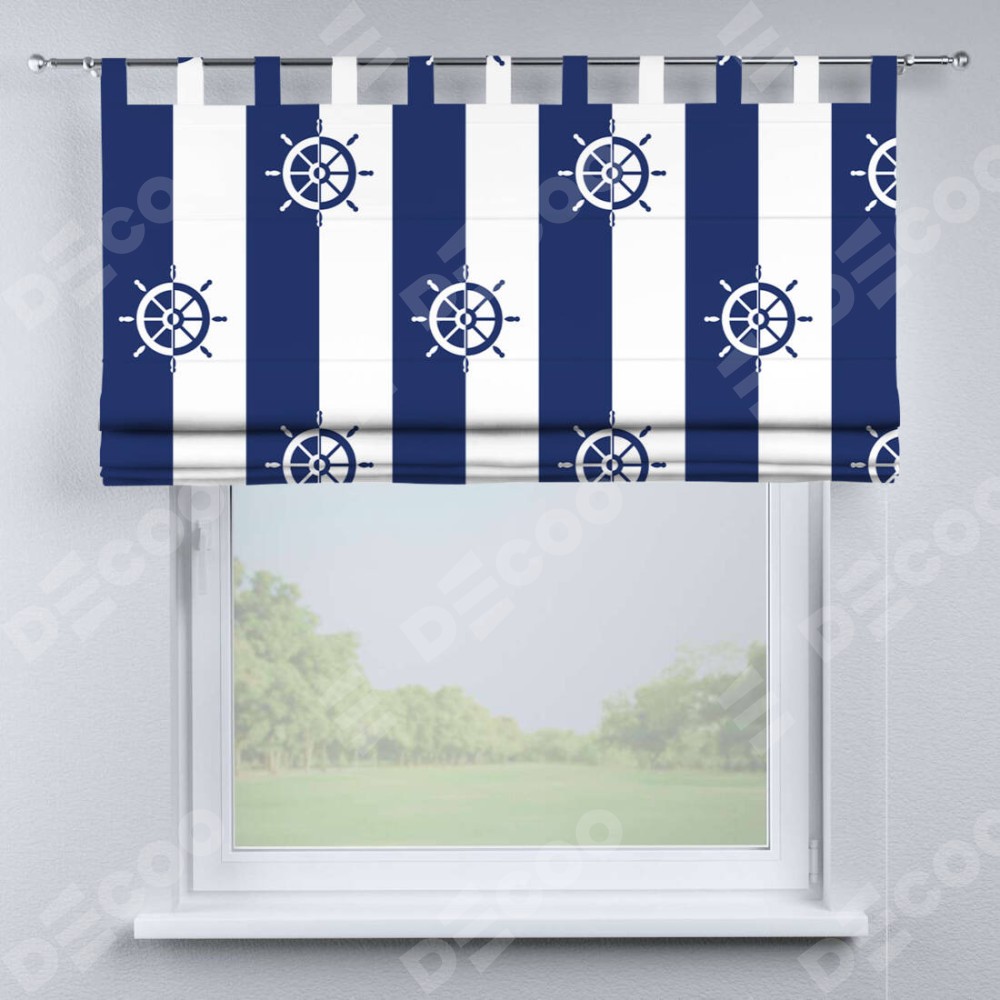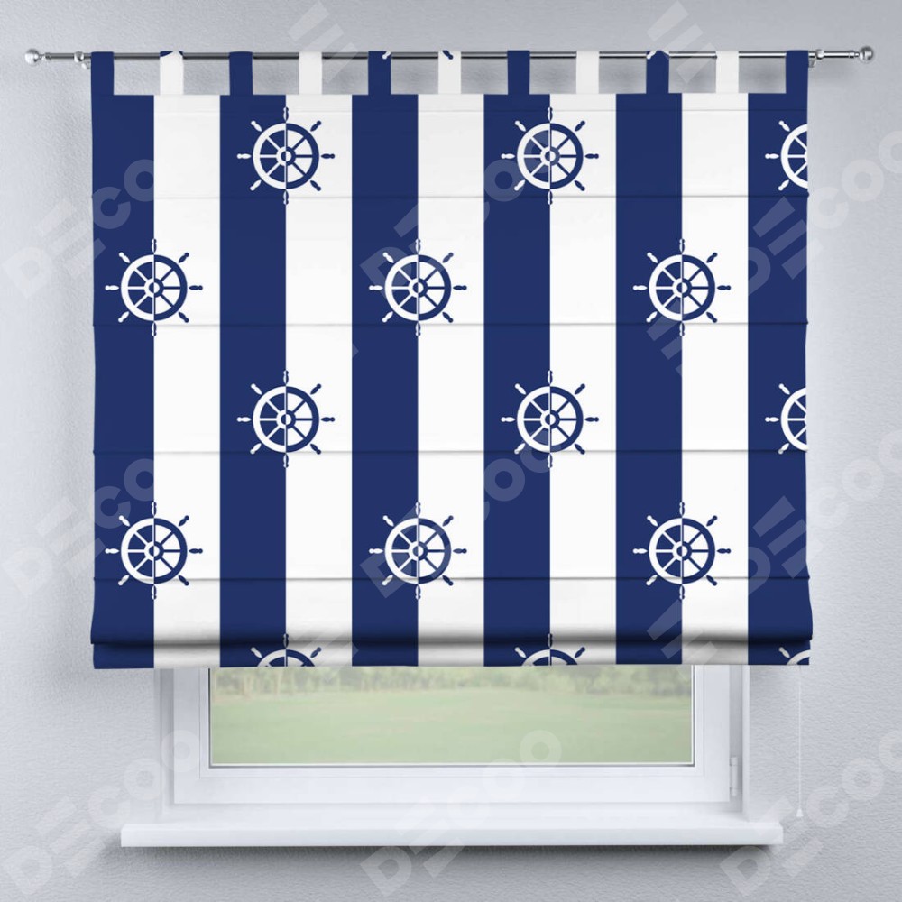 Римская штора производителя «Cortin», используется для проёма, пошита из ткани блэкаут с нанесением сублимационной печати «Полоски и штурвалы». Данная модель пошита на петлях, комплектуется на выбор круглым карнизом и подходит для монтажа на стену. Римская штора на петлях имеет простую систему регулировки высоты, отличительным преимуществом данной модели является простой способ монтажа. Достаточно повесить ее на трубу и штора готова!