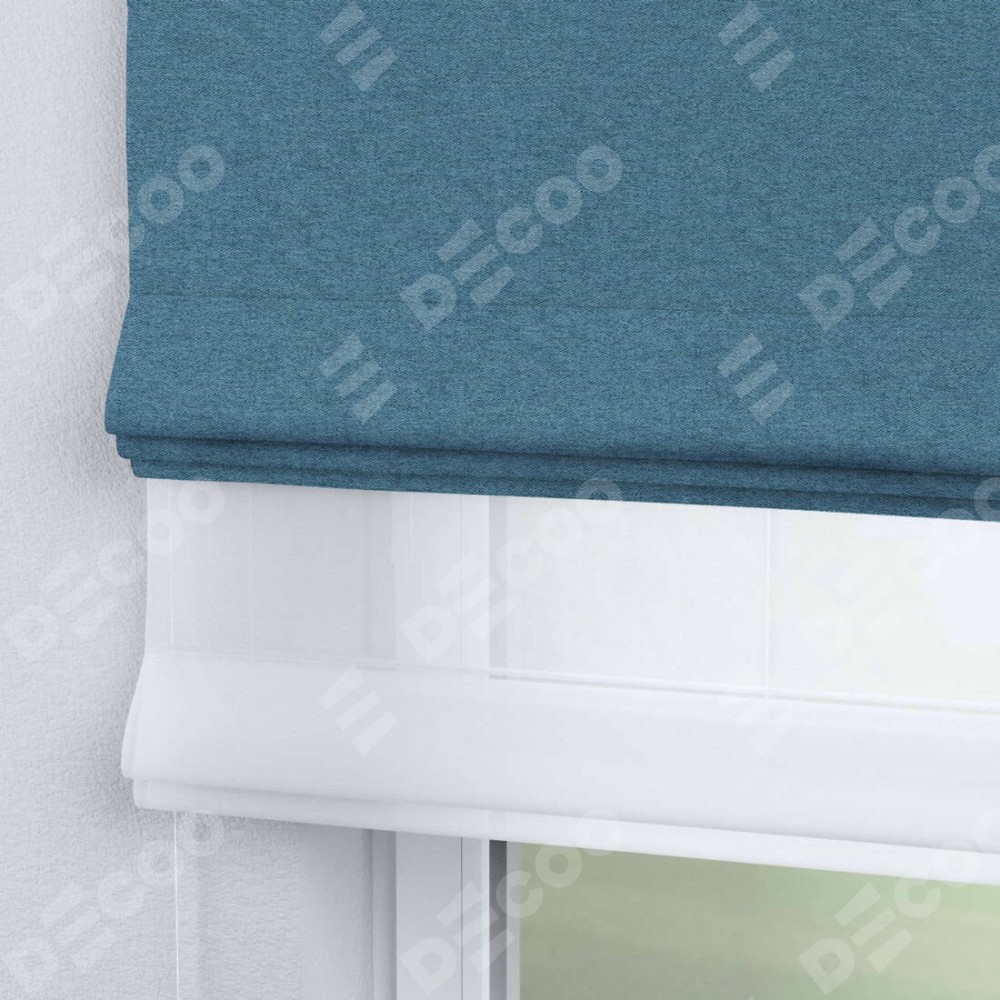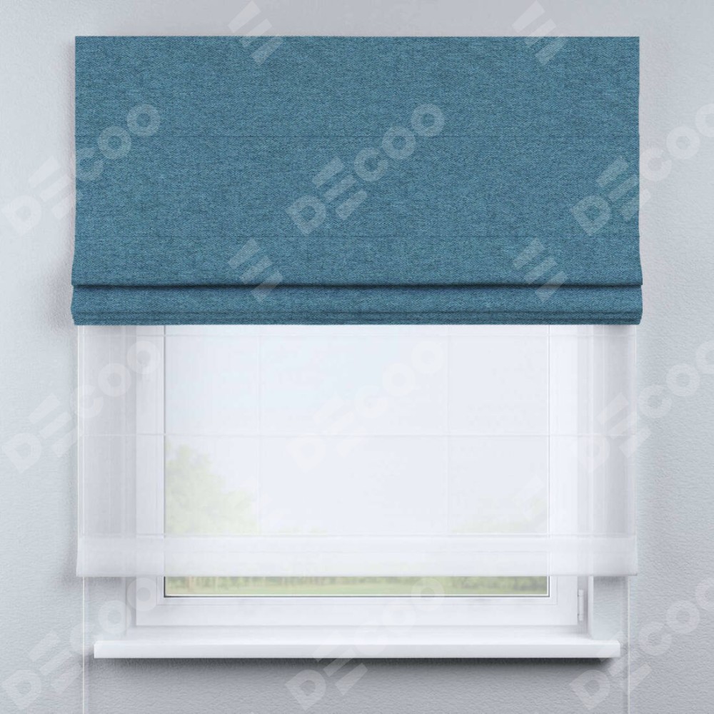 Римская штора день-ночь производителя «Cortin», используется для проёма, пошита из двух полотен, с лицевой стороны твид блэкаут светло-синий артикул 90935, вторая ткань тюль (по стандарту комплектуется тюль белого цвета артикул V-01). Имеет универсальный механизм и подходит для монтажа: на потолок, на стену и в нишу.
