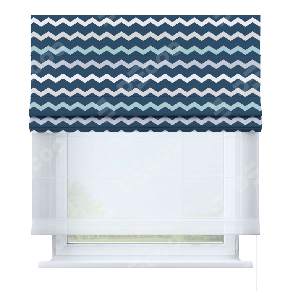 Римская штора день-ночь производителя «Cortin», используется для проёма, пошита из двух полотен, с лицевой блэкаут с нанесением сублимационной печати «Морской шеврон», вторая ткань тюль (по стандарту комплектуется тюль белого цвета артикул V-01). Имеет универсальный механизм и подходит для монтажа: на потолок, на стену и в нишу.